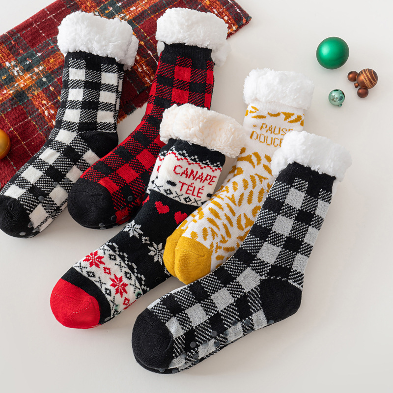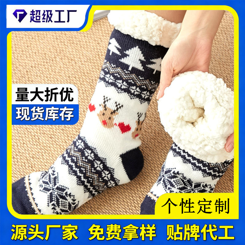 袜子冬季圣诞袜跨境加绒加厚地板袜点胶防滑居家睡眠月子女士袜子