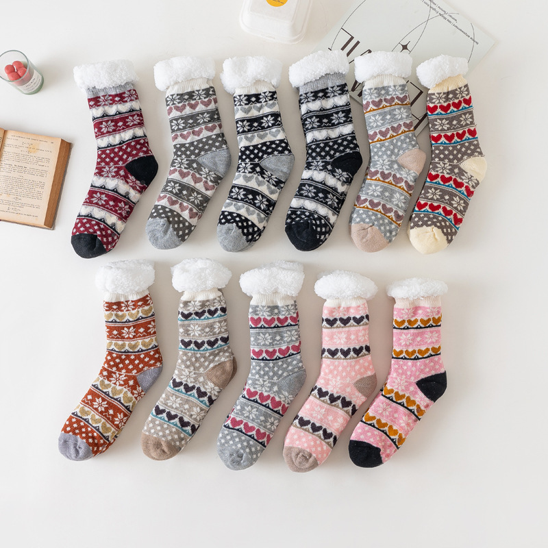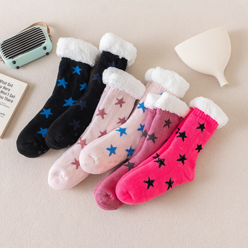 新款秋冬雪花元素袜子女士加绒加厚羊羔绒保暖点胶防滑居家地板袜