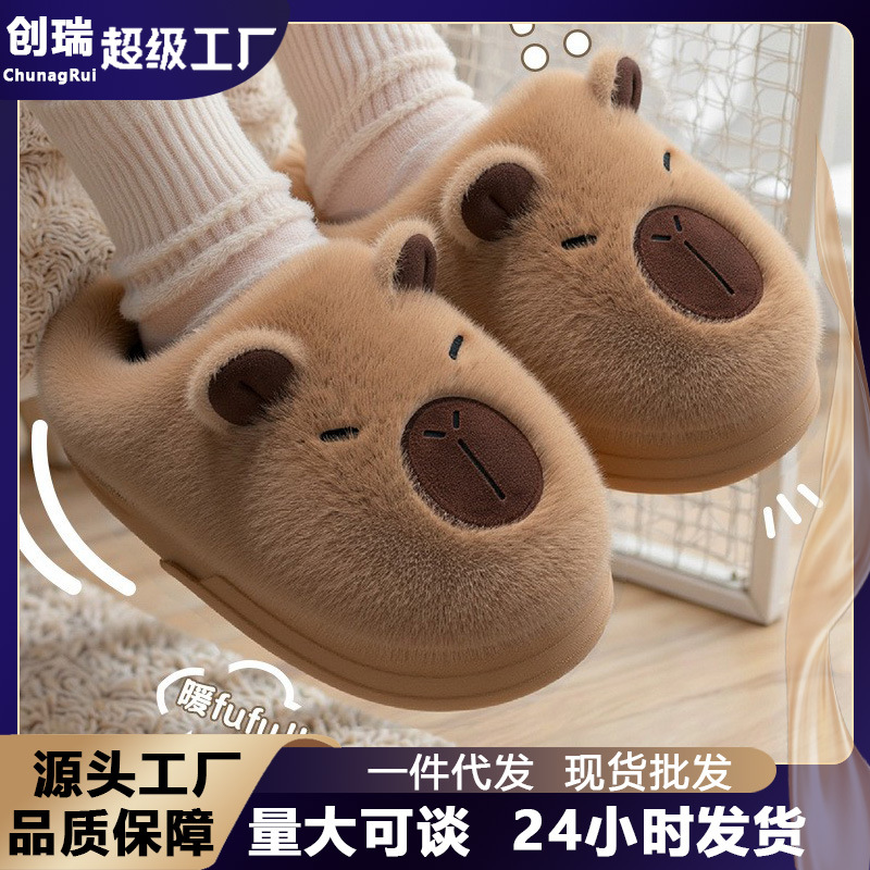 卡皮巴拉厚底毛绒棉拖鞋女冬季室内外穿情侣保暖包头外穿拖鞋批发