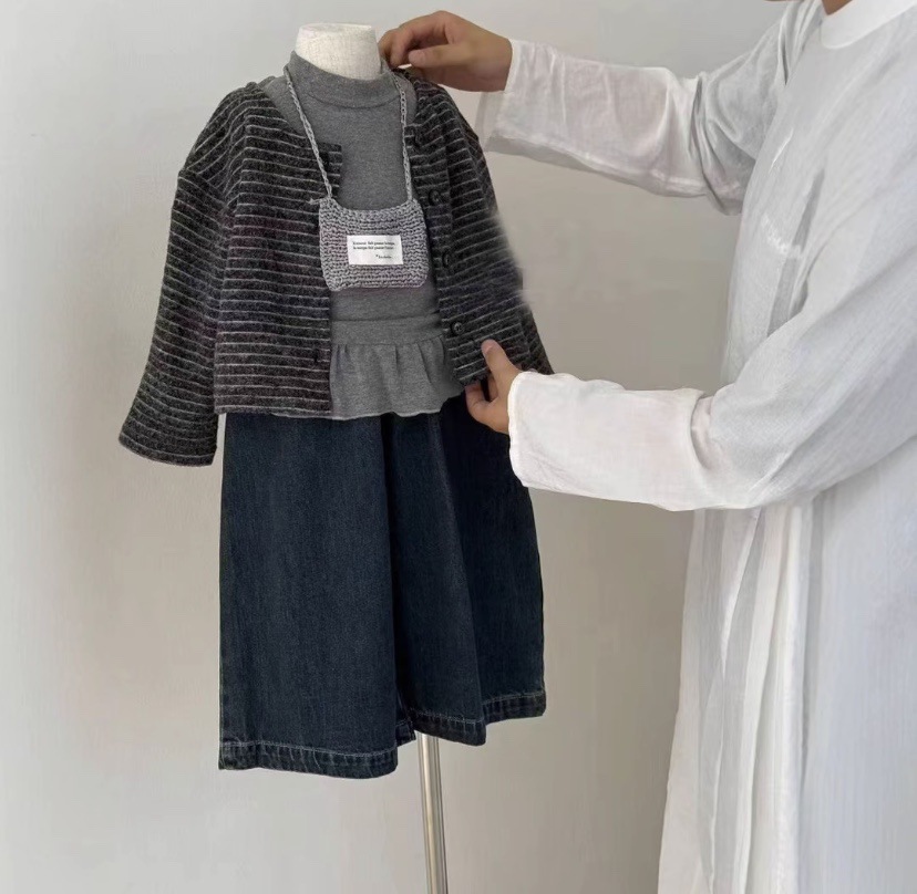 韩版童装2025秋季新款女宝宝条纹开衫花边打底衫牛仔阔腿裤三件套