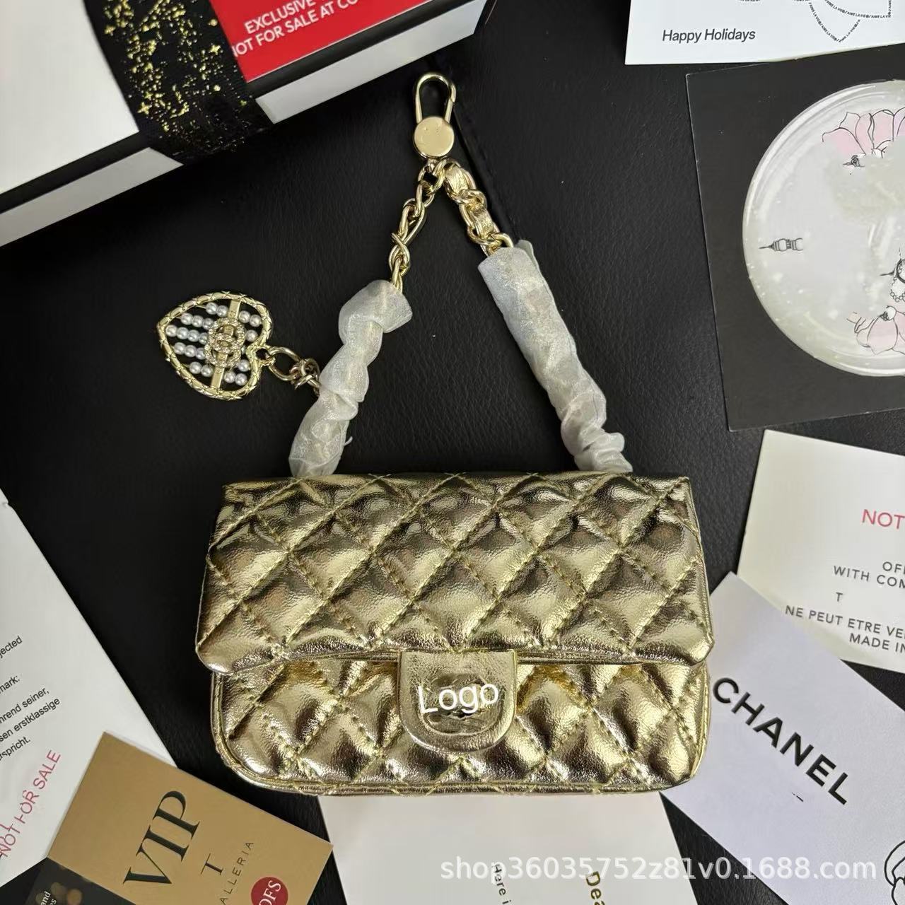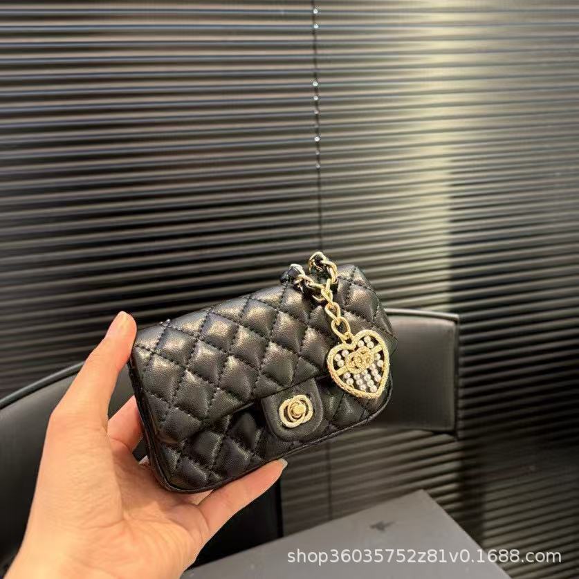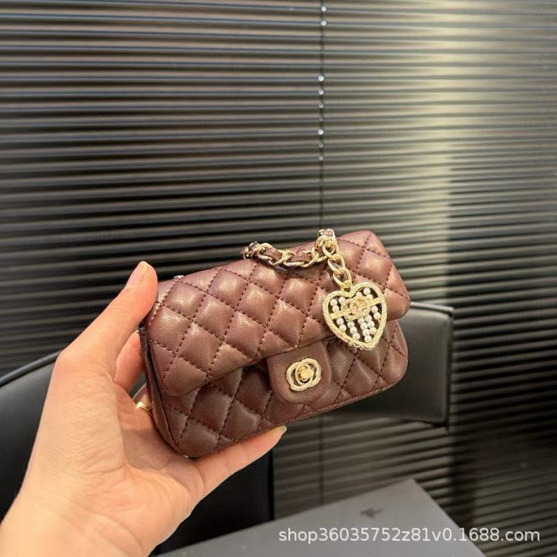 25A cf爱心链条挂件羊皮方胖子珍珠链条菱格口盖包斜挎手机包轻奢