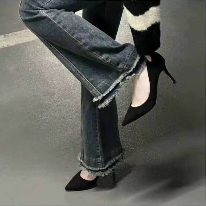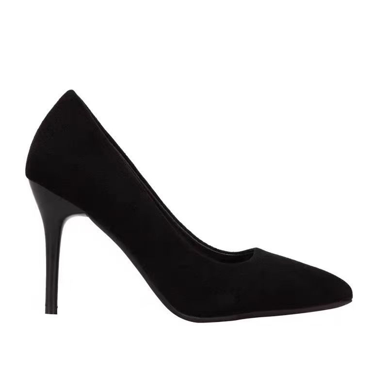 2025款高跟鞋细跟黑色尖头绒面百搭职业春秋少女工作面试单鞋