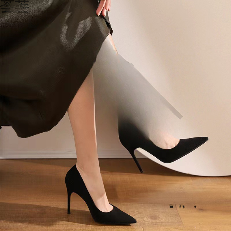 ビッグヒールスエードブラックワークシューズ薄型42口ワーク2025春秋ライトプロコードポインテッドトゥ新しいハイヒール女性用