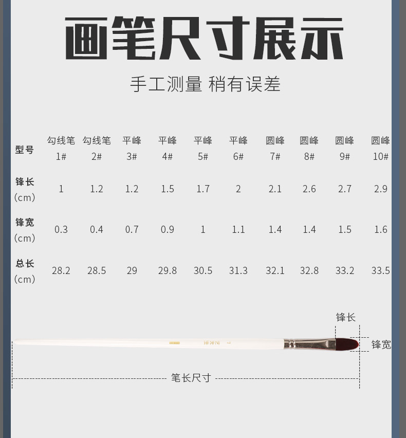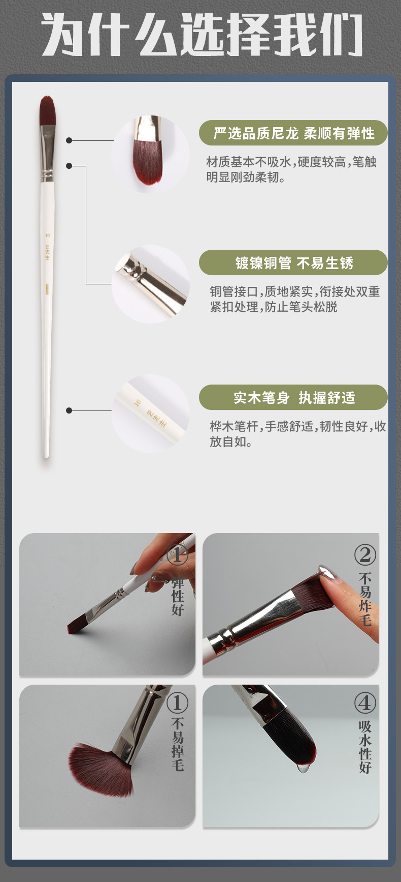 型号 艺先生尼龙画笔10支,勾线笔1号,勾线笔2号,平峰笔3号,平峰笔4号,平峰笔5号,平峰笔6号,鸭舌笔7号,鸭舌笔8号,鸭舌笔9号,鸭舌笔10号