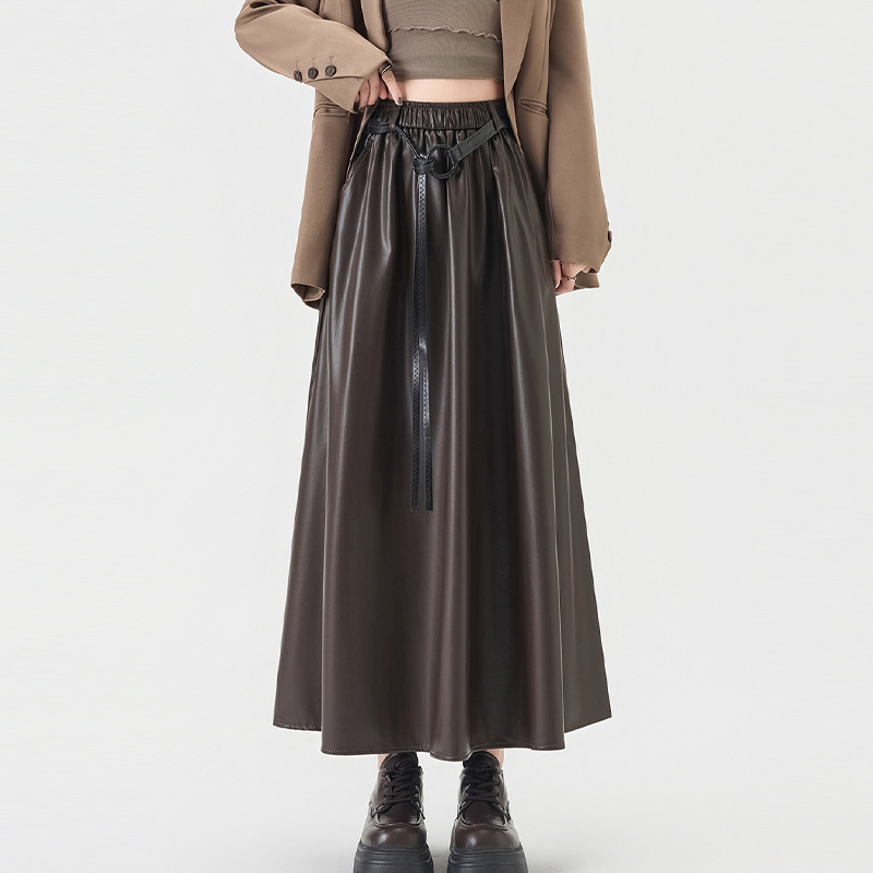 大裙摆欧美女士春秋季新款高腰通勤伞裙PU皮设计感百搭a字半身裙