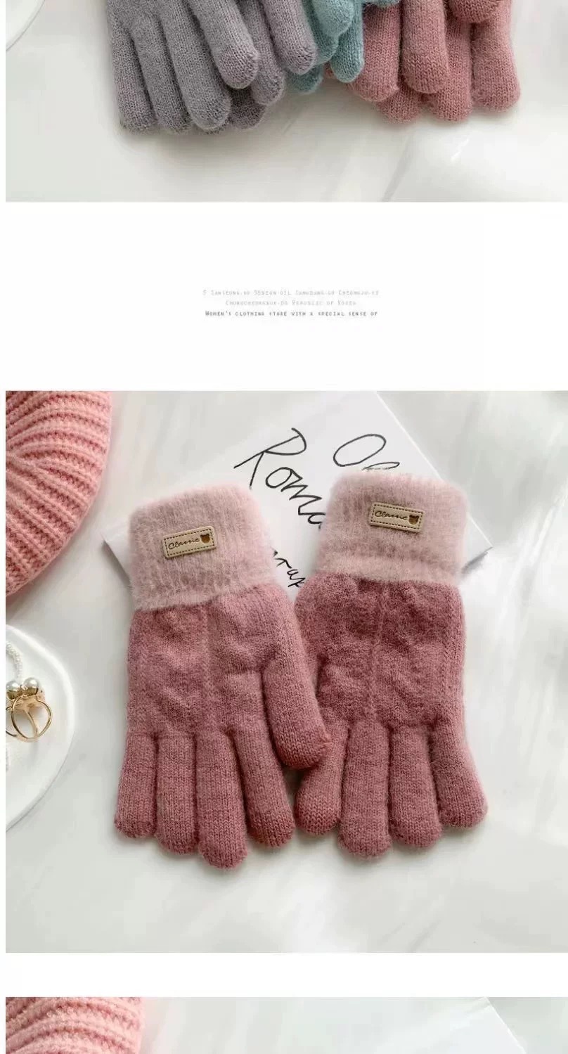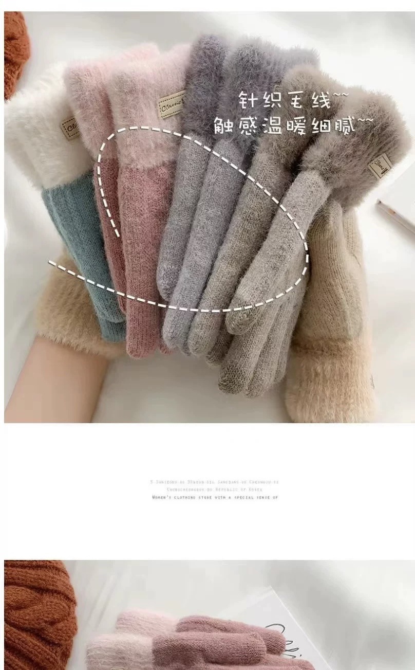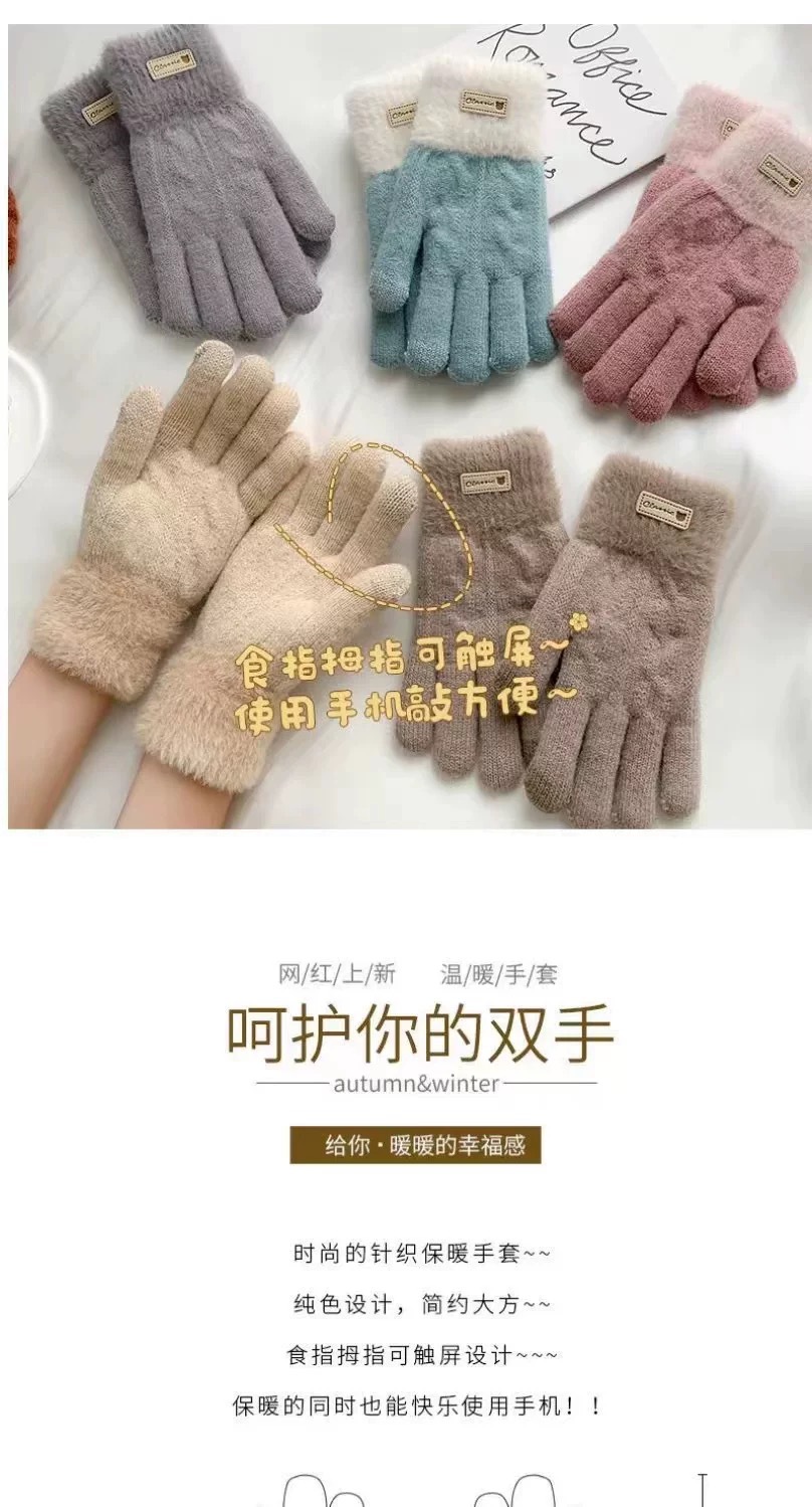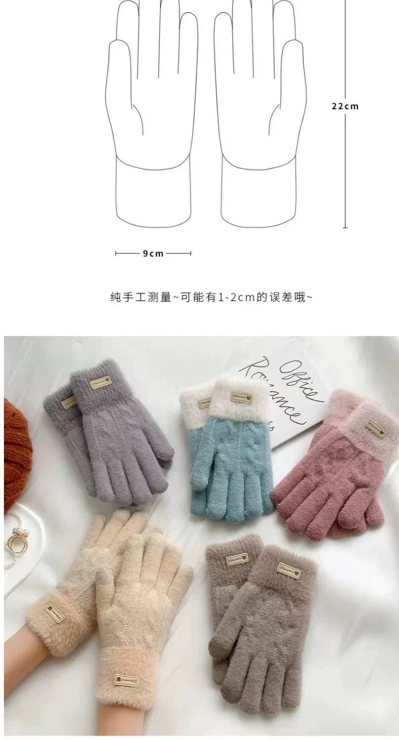 五指触屏毛绒双层编织毛线手套女秋冬季针织保暖骑行加绒加厚批发
