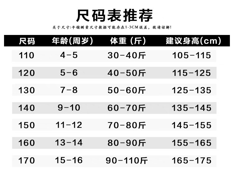 适合身高 100(建议身高),110(建议身高),120(建议身高),130(建议身高),140(建议身高),150(建议身高),160(建议身高),170(建议身高)