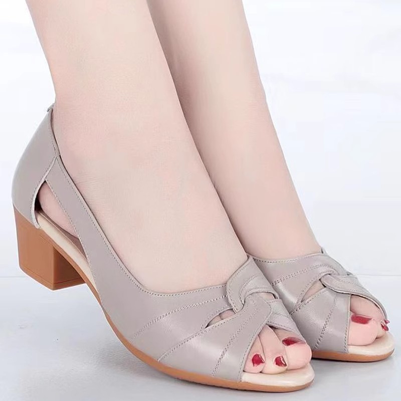 2025 新しい夏のソフトレザーサンダル女性のミディアムヒールソフトソール中年魚口ママの靴ノンスリップスリッポン女性の靴