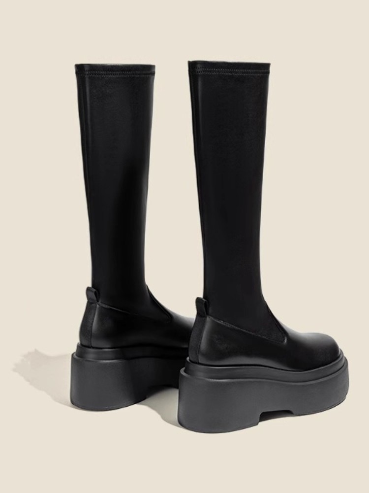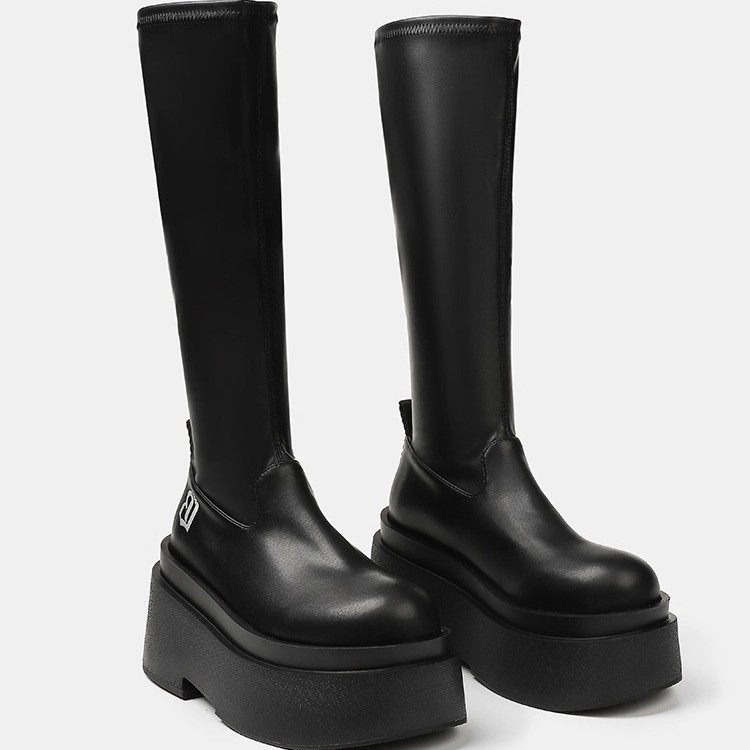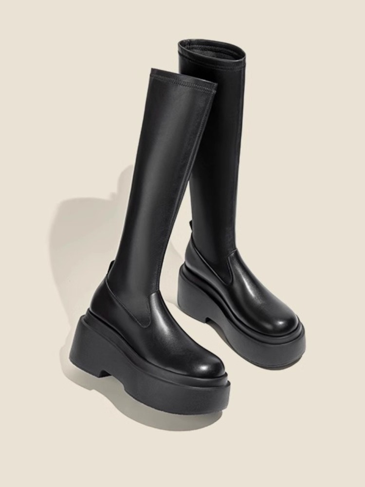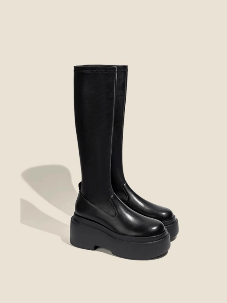 英伦风2025新款软皮厚底长筒靴弹力瘦瘦靴增高长靴子高筒骑士靴女
