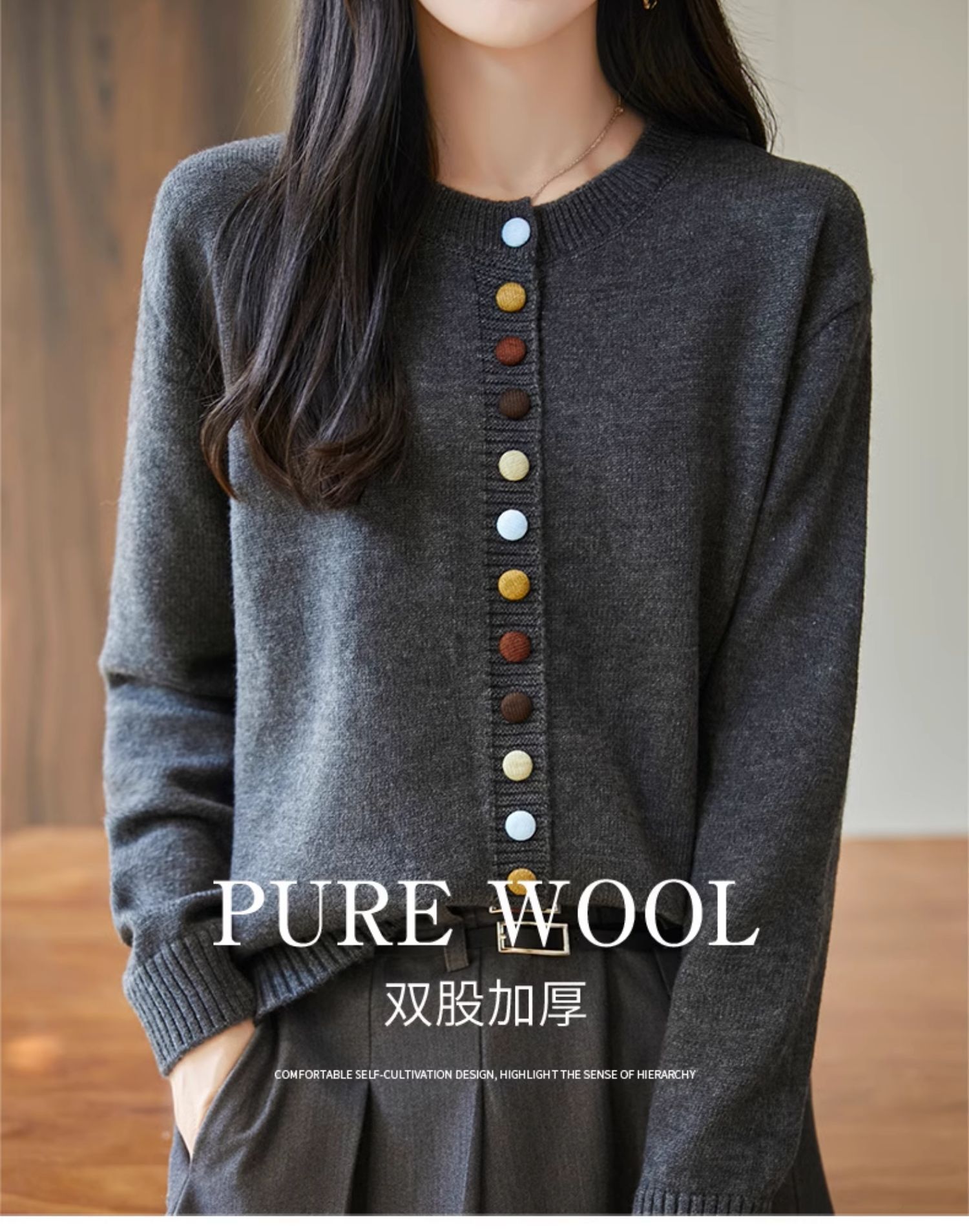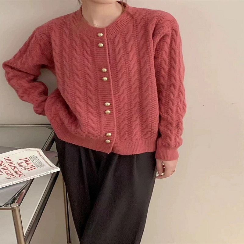 2025秋季新款毛衣复古麻花金扣针织开衫圆领纯色上衣简约甜美清新