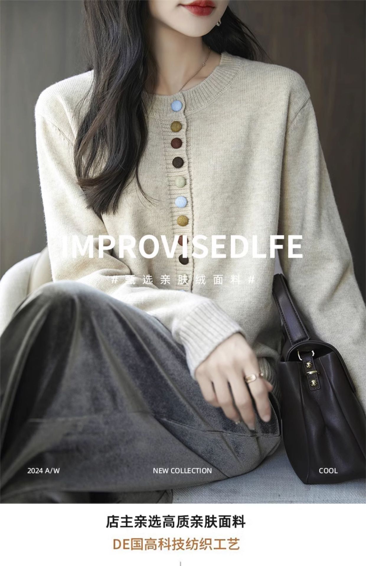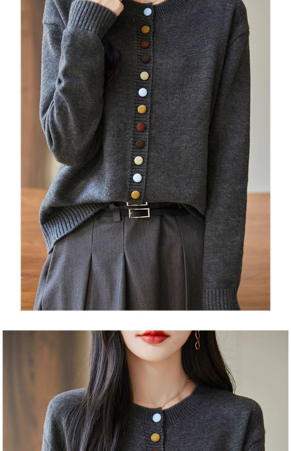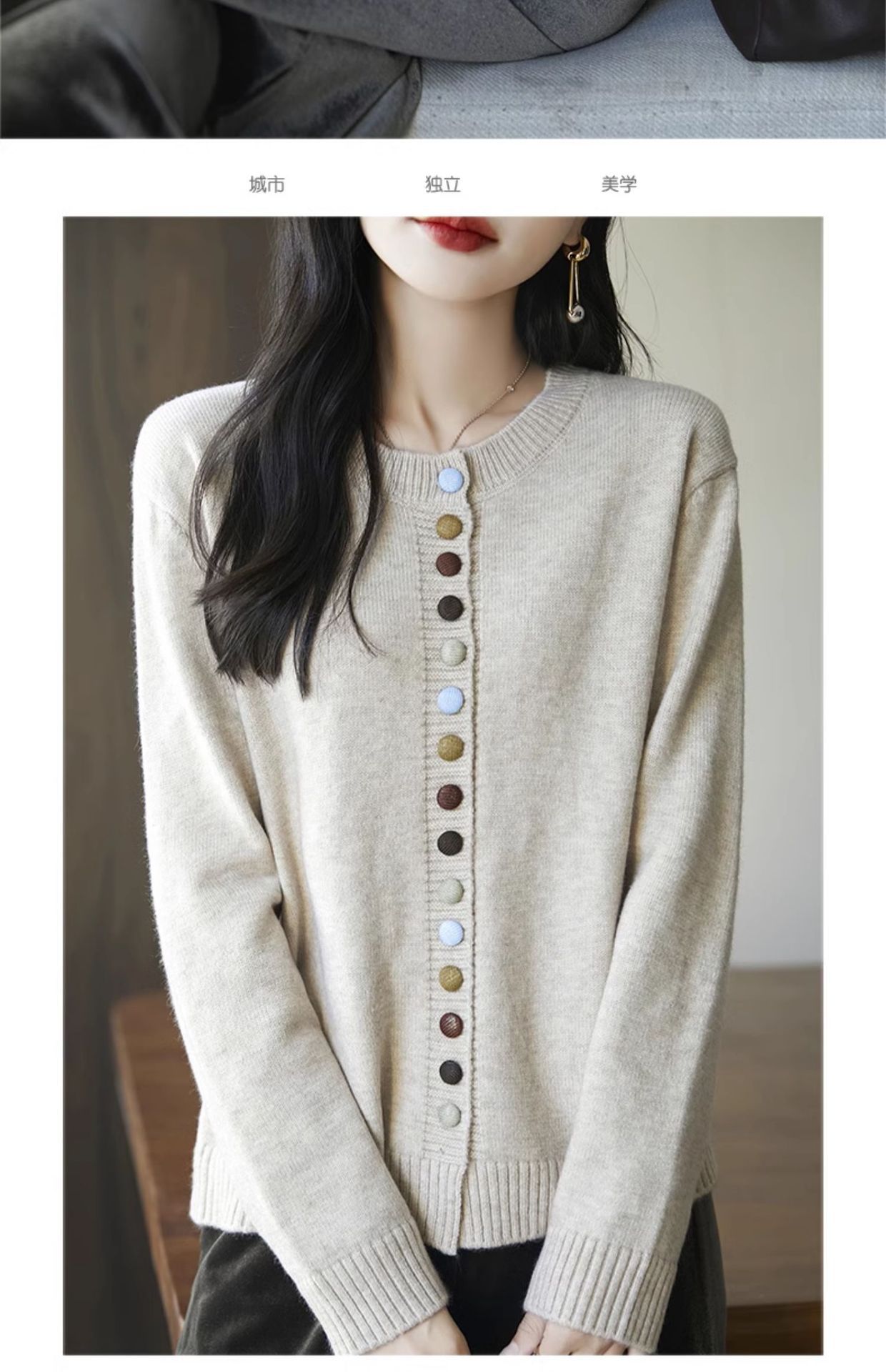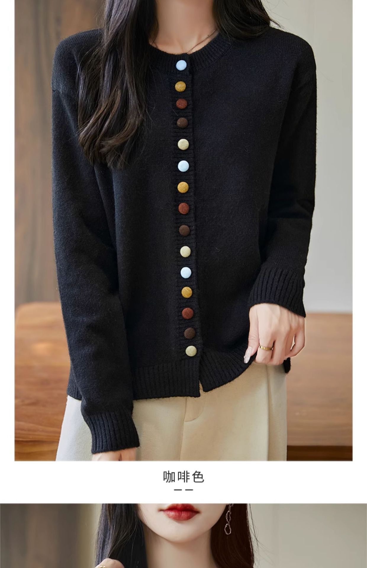 圆领洋气开衫外套女秋季女装彩色扣子撞色文艺范宽松百搭针织上衣