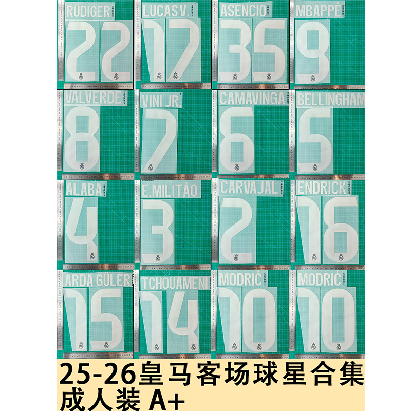 25-26 レアル マドリード アウェイ スター コレクション 大人用 A+ ジャージ番号レターホットプリント番号熱転写ステッカー