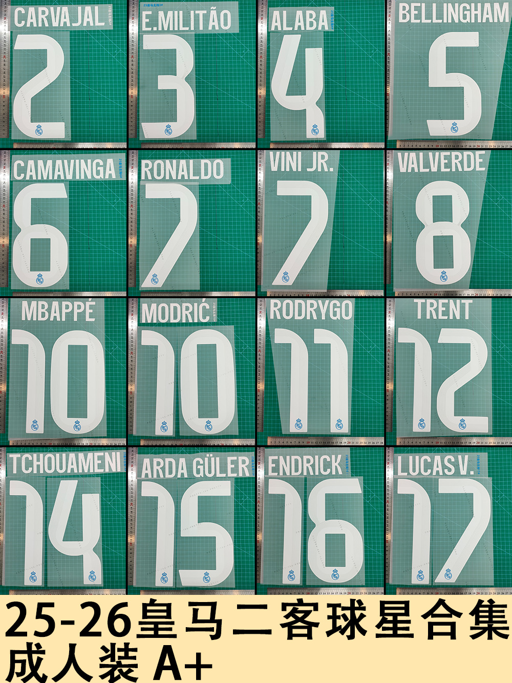 颜色 25-26皇马二客 成人装 A+ 3#E.MILITAO,25-26皇马二客 成人装 A+ 4#ALABA,25-26皇马二客 成人装 A+ 5#BELLINGHAM,25-26皇马二客 成人装 A+ 6#CAMAVINGA,25-26皇马二客 成人装 A+ 7#RONALDO,25-26皇马二客 成人装 A+ 7#VINI JR,25-26皇马二客 成人装 A+ 8#VALVERDE,25-26皇马二客 成人装 A+ 9#MBAPPE,25-26皇马二客 成人装 A+ 10#MBAPPE,25-26皇马二客 成人装 A+ 10#MODRIC,25-26皇马二客 成人装 A+ 11#RODRYGO,25-26皇马二客 成人装 A+ 12#TRENT,25-26皇马二客 成人装 A+ 14#TCHOUAMENI,25-26皇马二客 成人装 A+ 15#ARDA GULER,25-26皇马二客 成人装 A+ 16#ENDRICK,25-26皇马二客 成人装 A+ 17#LUCASV,25-26皇马二客 成人装 A+ 18#VALLEJO,25-26皇马二客 成人装 A+ 22#RUDIGER,25-26皇马二客 成人装 A+ 24#HUIJSEN,25-26皇马二客 成人装 A+ 30#MASTANTUONO,25-26皇马二客 成人装 A+ 35#ASENCIO