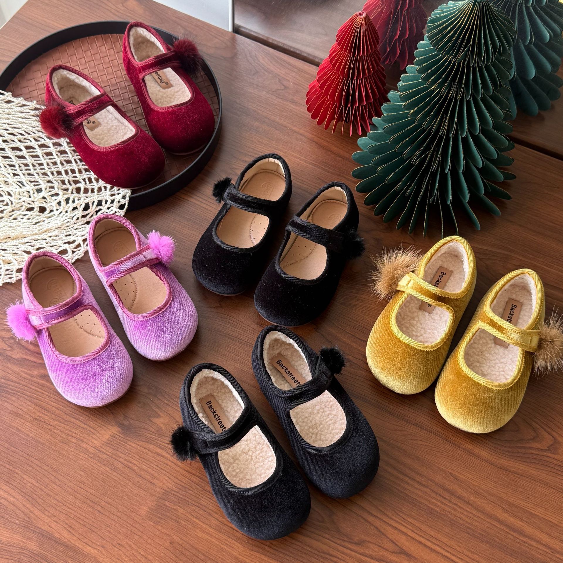 女童单鞋2025秋冬新款丝绒公主鞋可爱毛球玛丽珍单鞋软底百搭过年