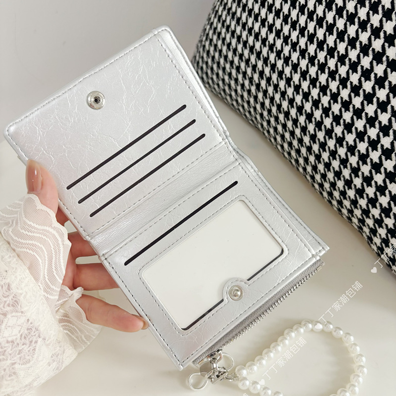 黛妮韩版新品爆裂纹简约纯色珍珠蝴蝶结吊坠两折拉链搭扣短款钱包