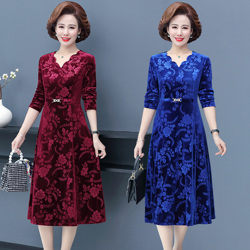 2025春秋新作マザーズドレス、洋風中年婦人服、春秋長袖ゴールドベルベットスカート、レディースロングスカート