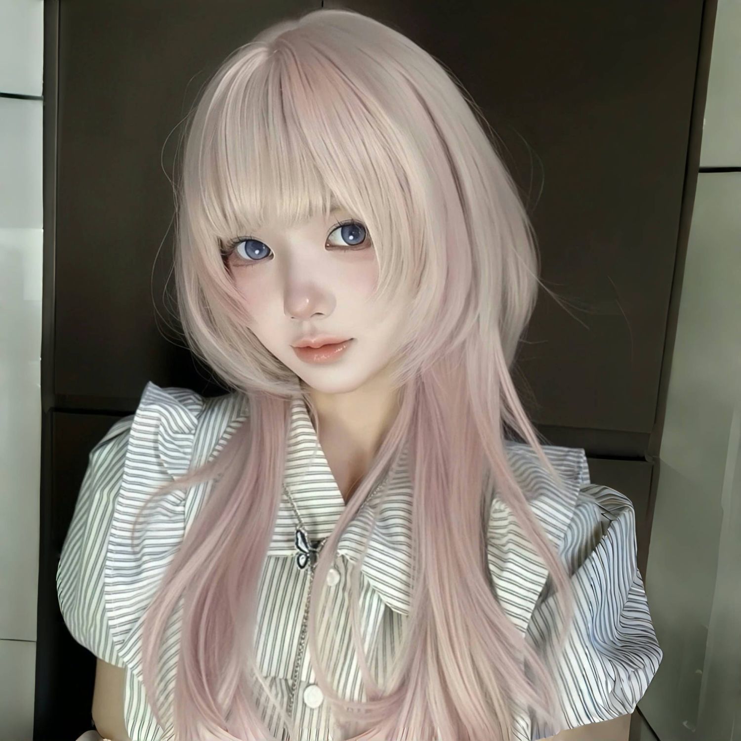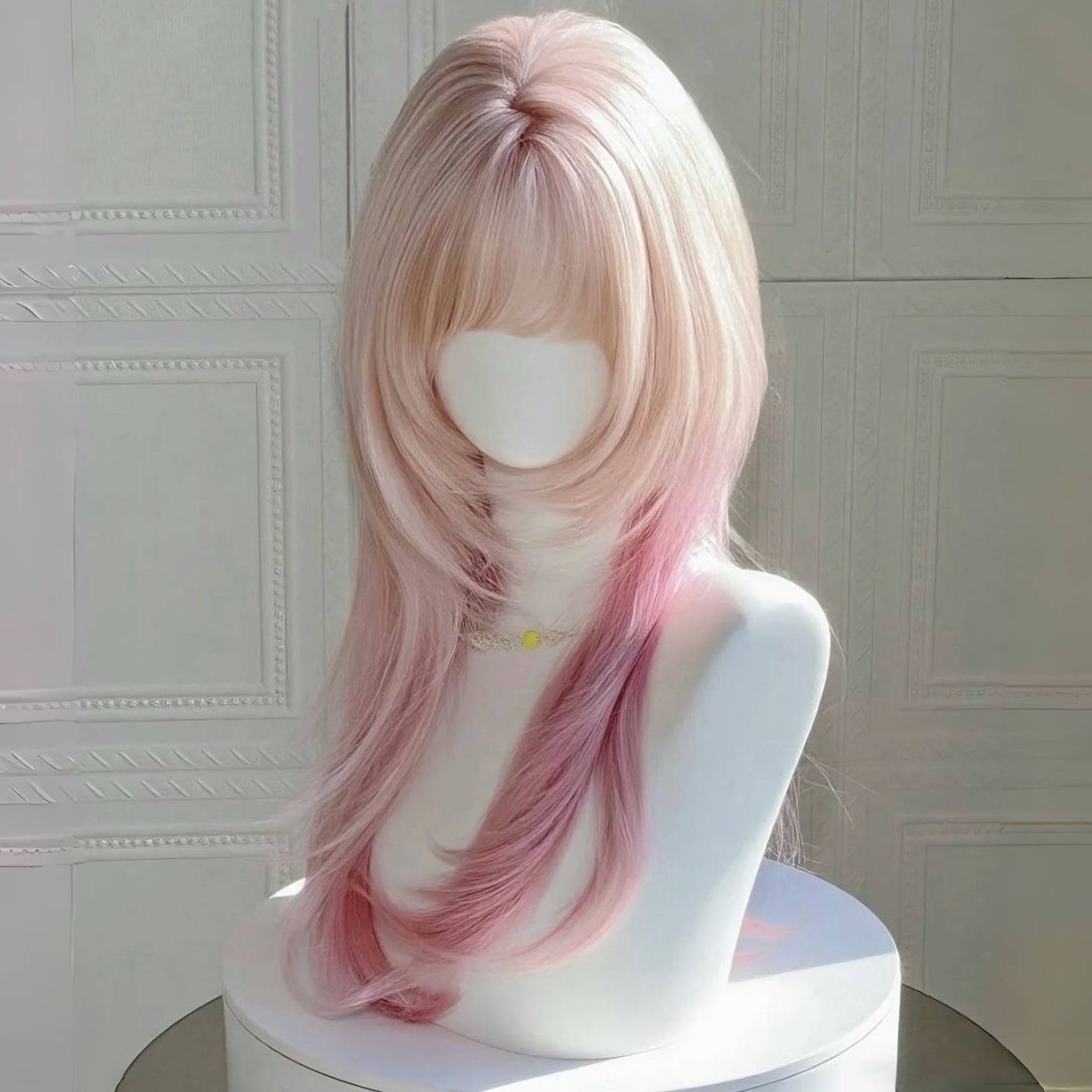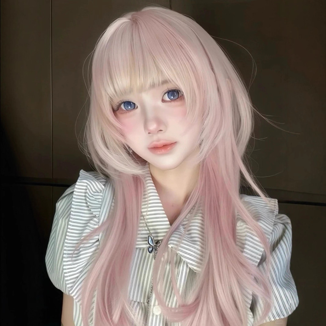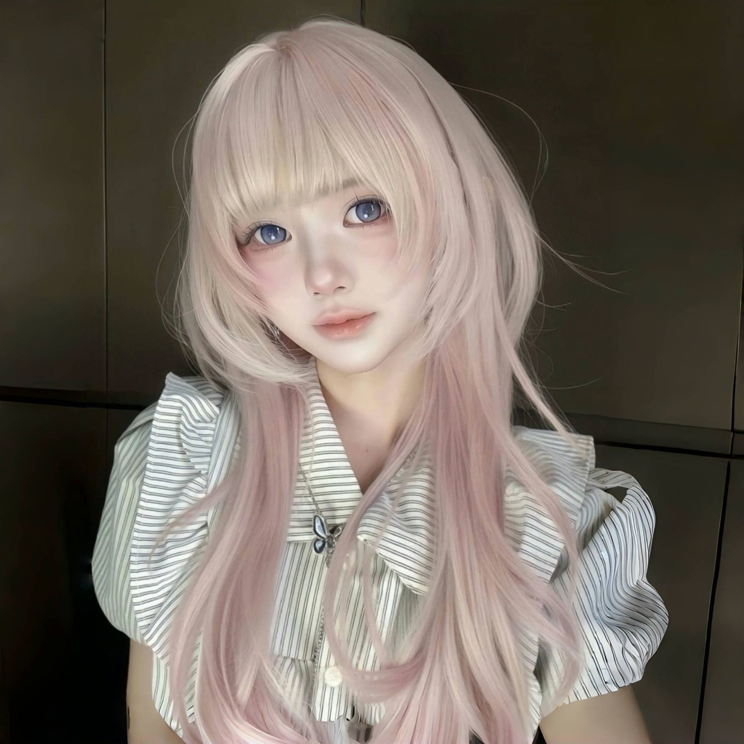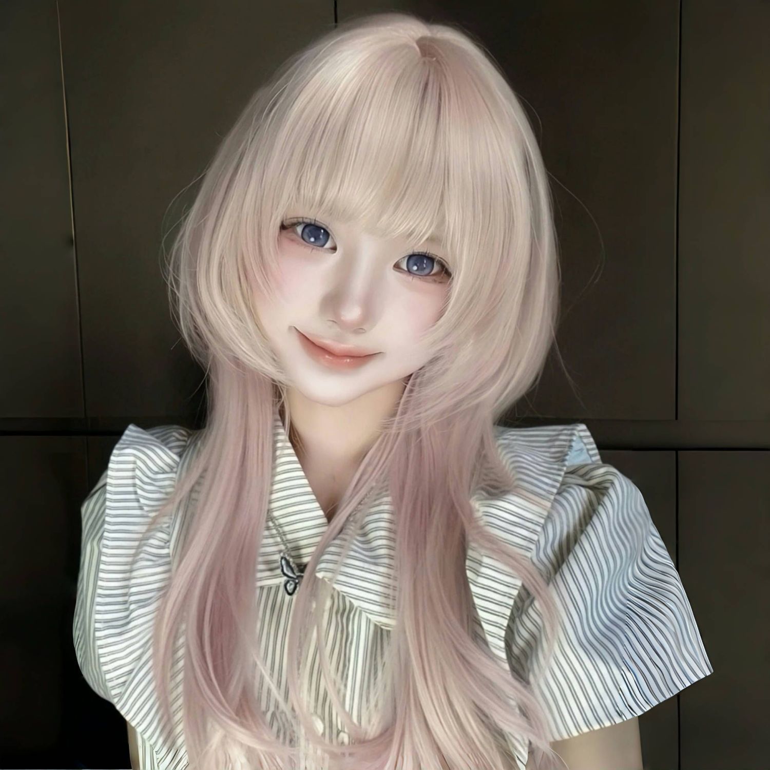 【ピンクサクラ】ピンクウィッグ 女性ロリータ シャギーバング ハイレベルロングストレートヘア ライトカラー ナチュラル 女性グループ フルヘッドギア