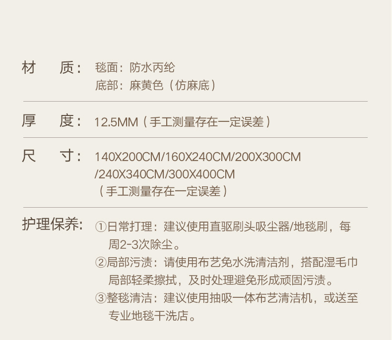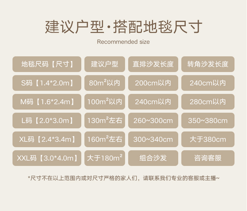 尺寸 140*200cm【适合2-3人位沙发】,160*240cm【适合3人或L形沙发】,200*300cm【适合4人或L形沙发】,240*340cm【适合大客厅或U形沙发】,300*400cm【适合大客厅或U形沙发】