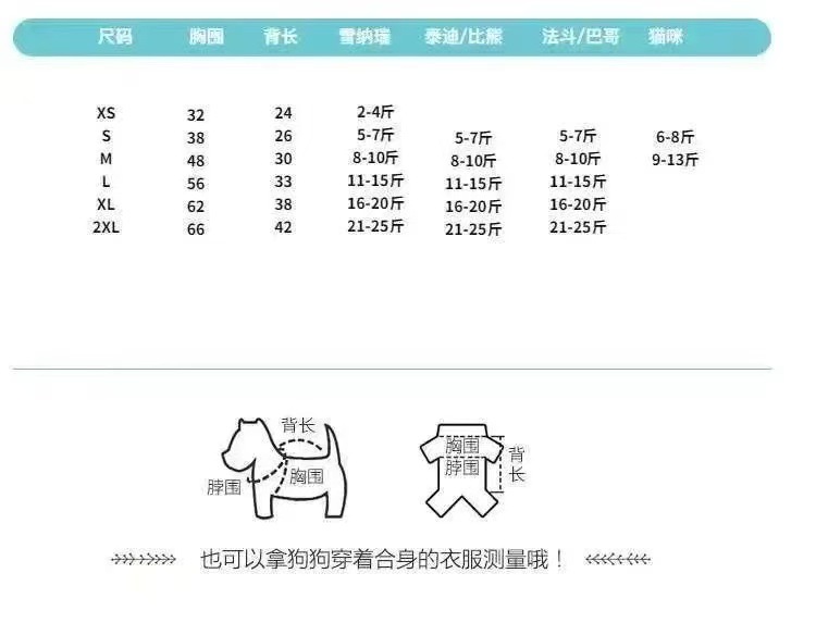 尺码 S(胸围38 建议5-7斤),M(胸围48 建议8-10斤),L(胸围56 建议11-15斤),XL(胸围 62 建议17-20斤),2XL(胸围66 建议21-25斤)