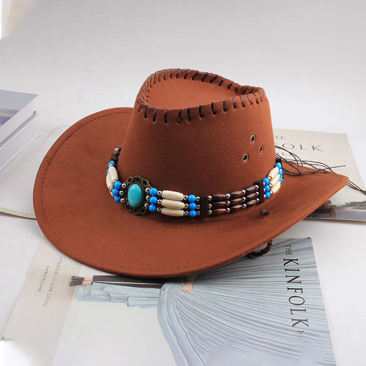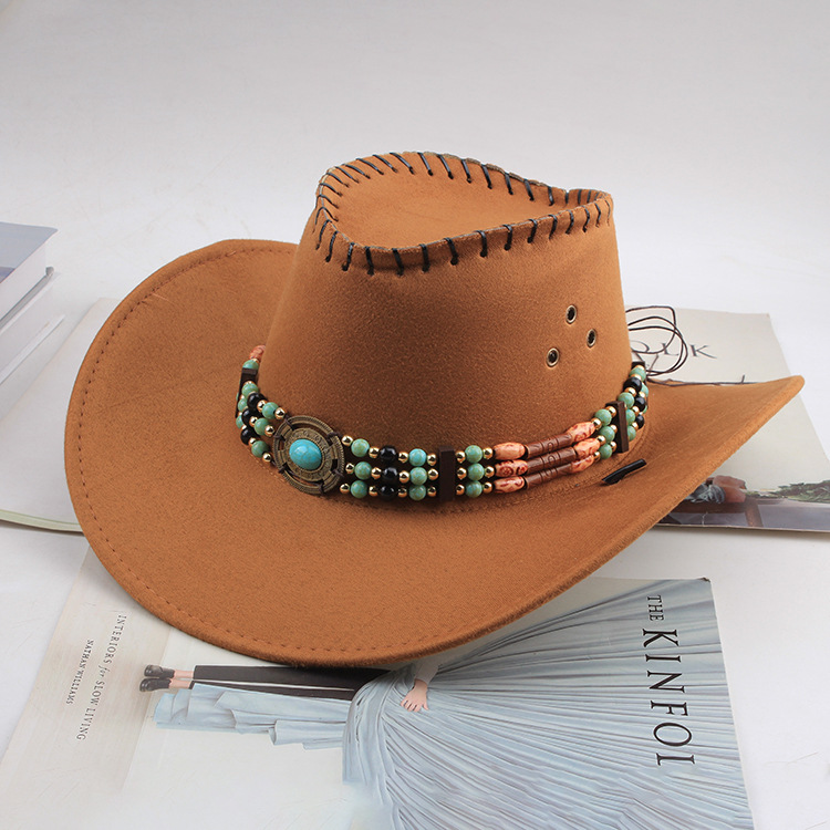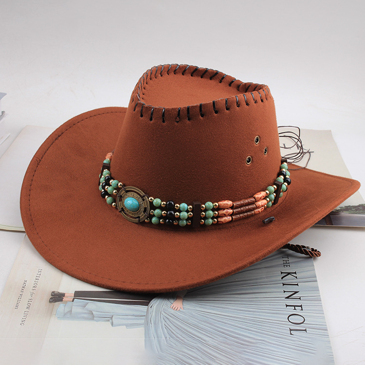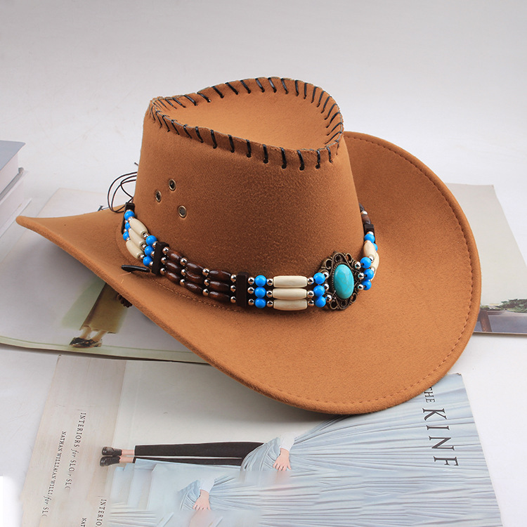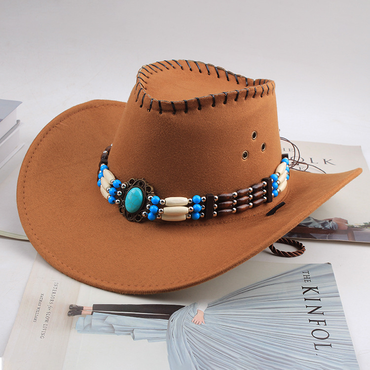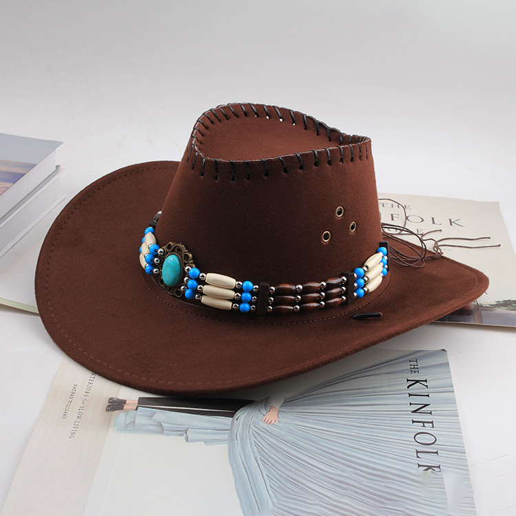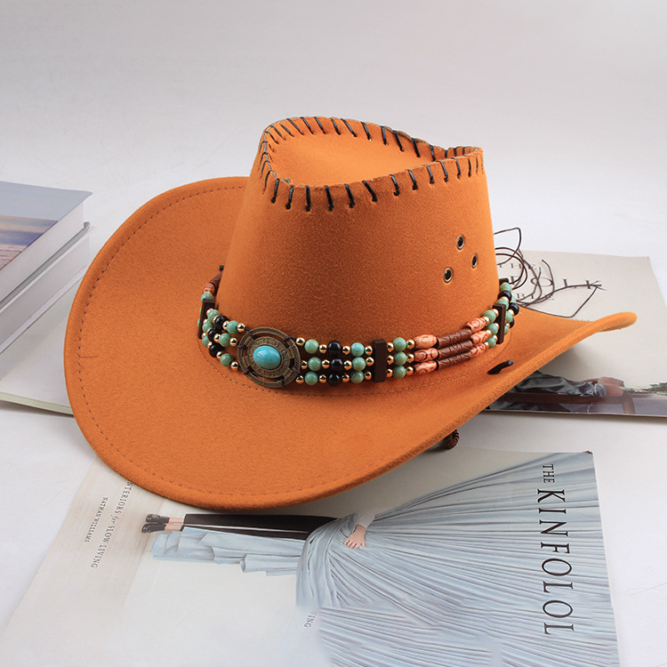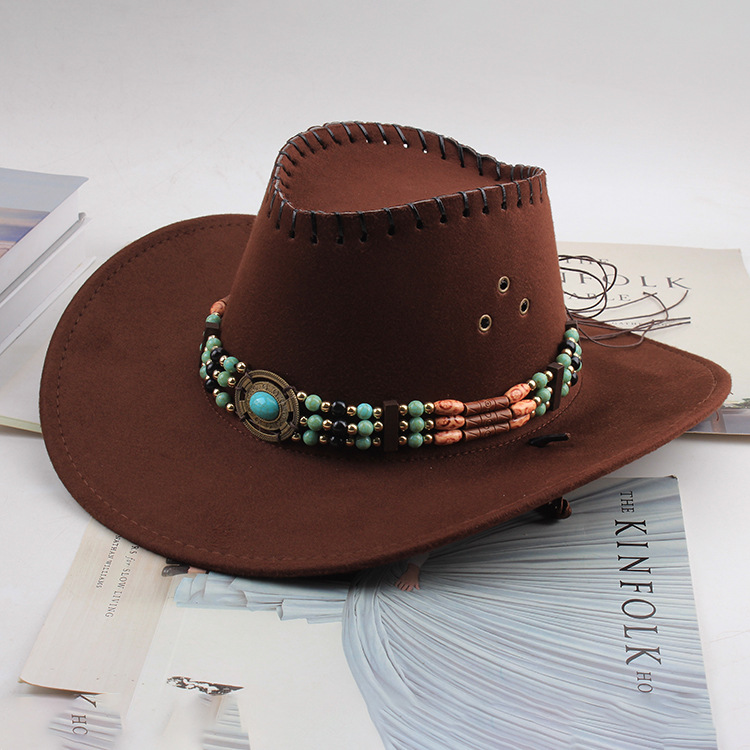 ヨーロッパとアメリカのレトロなウエスタンカウボーイハット、チベットスタイルの大きなつばの帽子、男性と女性のジャズハット、日焼け止め乗馬帽子、サンハットビーズ