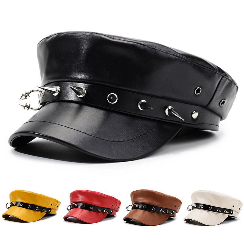 秋冬季PU皮平顶铆钉贝雷帽百搭鸭舌帽女新款法式英伦街头画家帽子