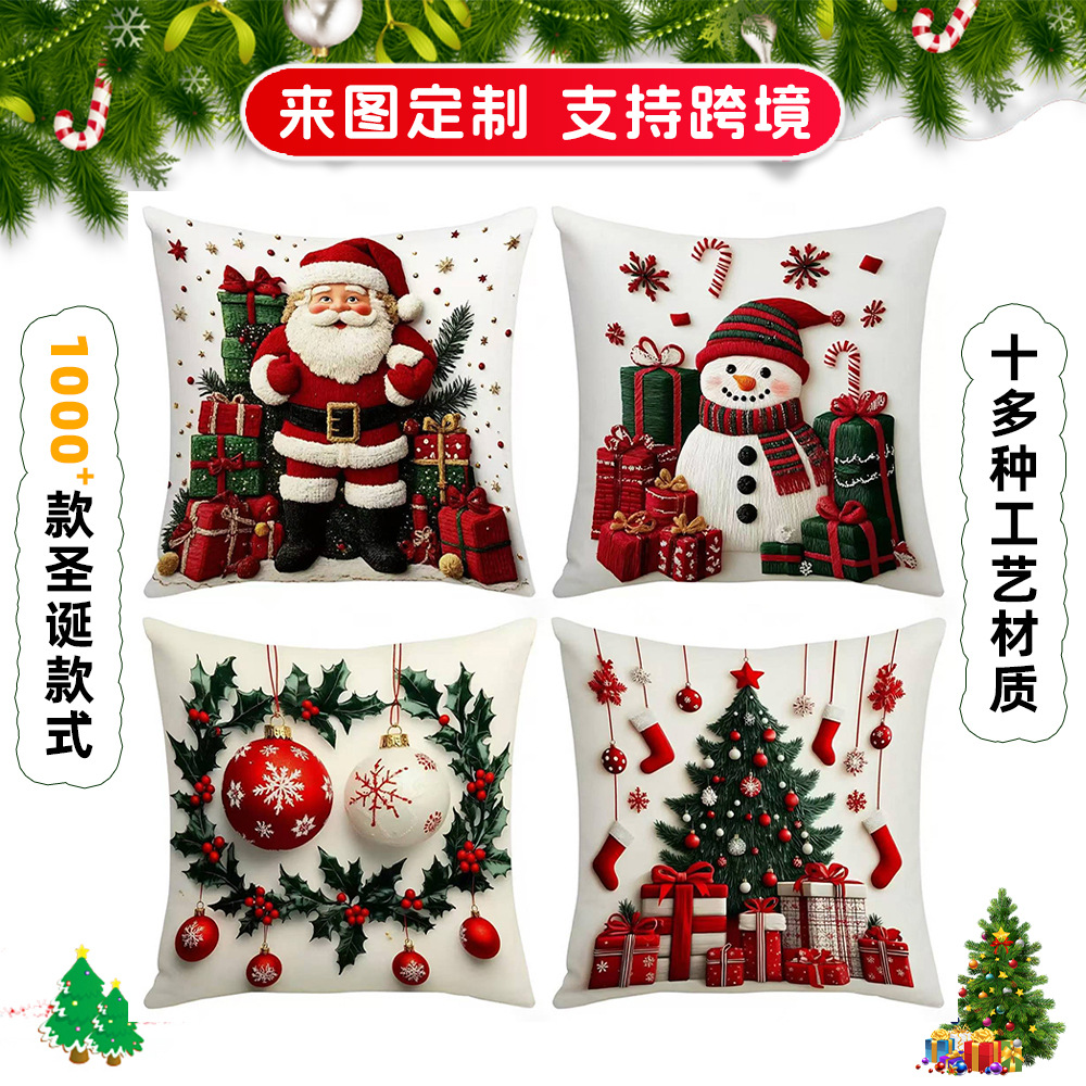 圣诞风立体刺绣高级感抱枕套雪人圣诞老人圣诞树麋鹿图案靠垫套