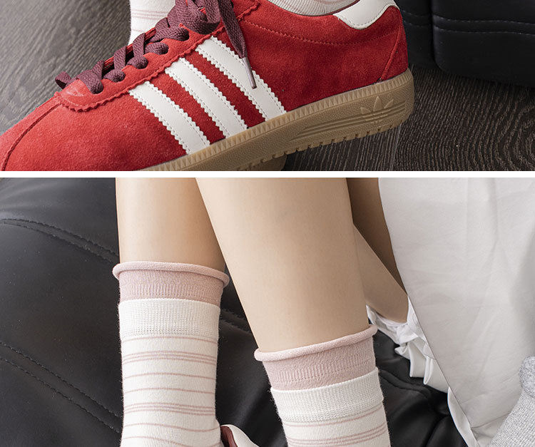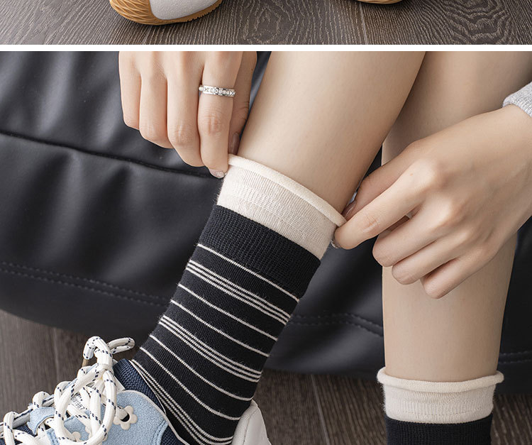 森系条纹袜子女春秋中筒袜ins潮撞色双罗口卷边休闲纯棉堆堆袜女