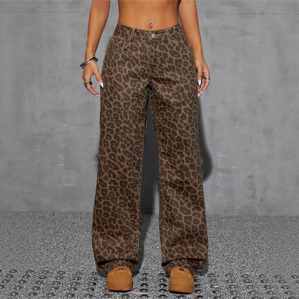 欧美复古豹纹高腰牛仔裤女款2025新款气质宽松拖地休闲裤子长女装