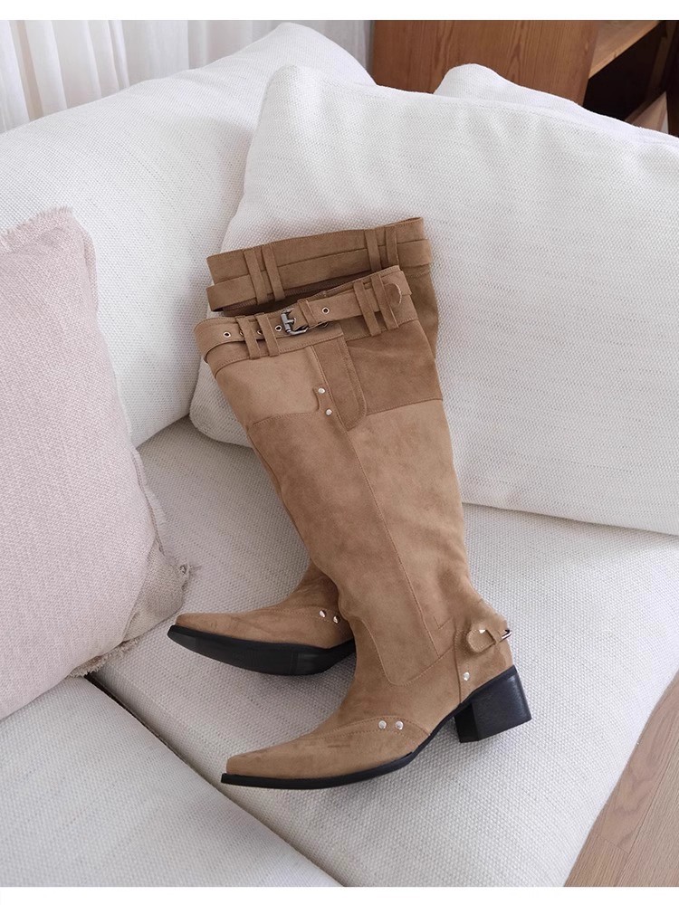 女性用膝丈ブーツ 2024 秋冬 カーキ スエード ポインテッドトゥ ブーツ 女性用 太いヒール スリム プリーツ パイルブーツ