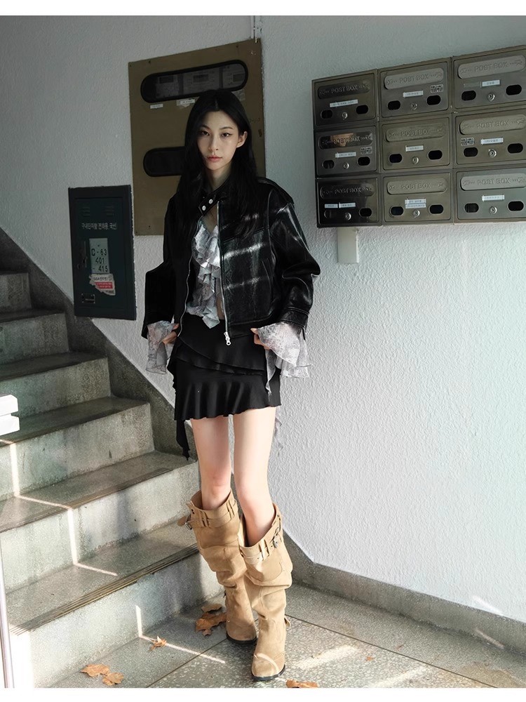 羊皮版不过膝辣妹长筒靴女显瘦粗跟西部骑士靴废土风堆堆靴高筒靴