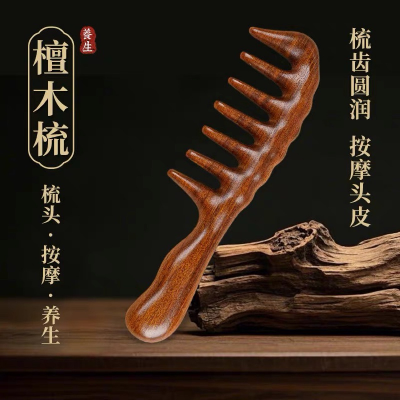 金糸檀木マッサージ櫛五歯丸頭経絡櫛体通用頭皮点穴檀木多用順髪