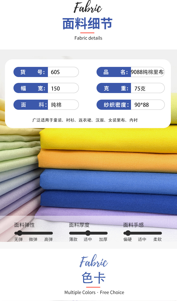 全プロセス60本精練薄い綿生地平布9088裏布シャツスカート枕芯皮衣バッグ裏布