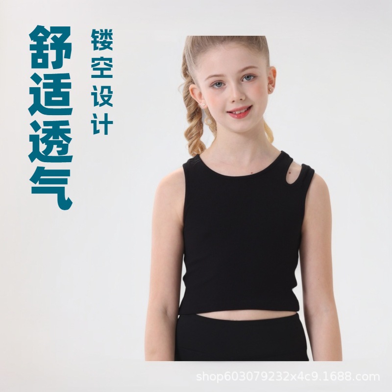 リブ編みのスリムフィット子供用ヨガウェアベスト、中空デザインで外でも着用可能、ランニングやスポーツに最適、快適で肩紐付き