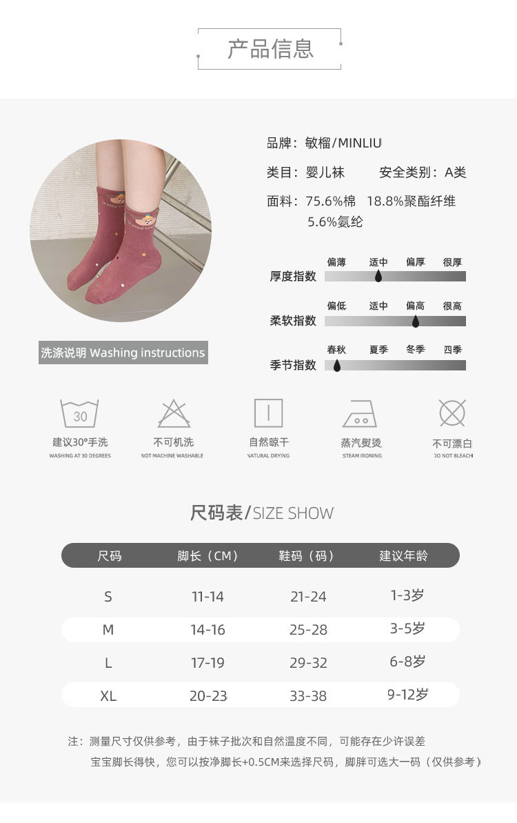 S码1-3岁【建议鞋码21-24码】,M码3-5岁【建议鞋码25-28码】,L码6-8岁【建议鞋码29-32码】,XL码9-12岁【建议鞋码33-37码】