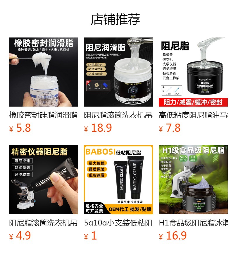 规格 【低粘度】阻尼脂30g,【中粘度】阻尼脂30g,【中低粘度】阻尼脂30g,【中高粘度】阻尼脂30g,【高粘度】Y-08阻尼脂30g,【超高粘度】阻尼脂30g,【低粘度】阻尼脂100g,【中粘度】阻尼脂100g,【低粘度】阻尼脂500g,【中粘度】阻尼脂500g,【低粘度】阻尼脂5g-管状,【低粘度】阻尼脂10g-管状,食品级阻尼脂-低粘-30g,食品级阻尼脂-中粘-30g,食品级阻尼脂-高粘-30g,食品级阻尼脂-低粘-120g,食品级阻尼脂-中粘-120g,食品级阻尼脂-高粘-120g,阻尼脂-中粘度-15公斤