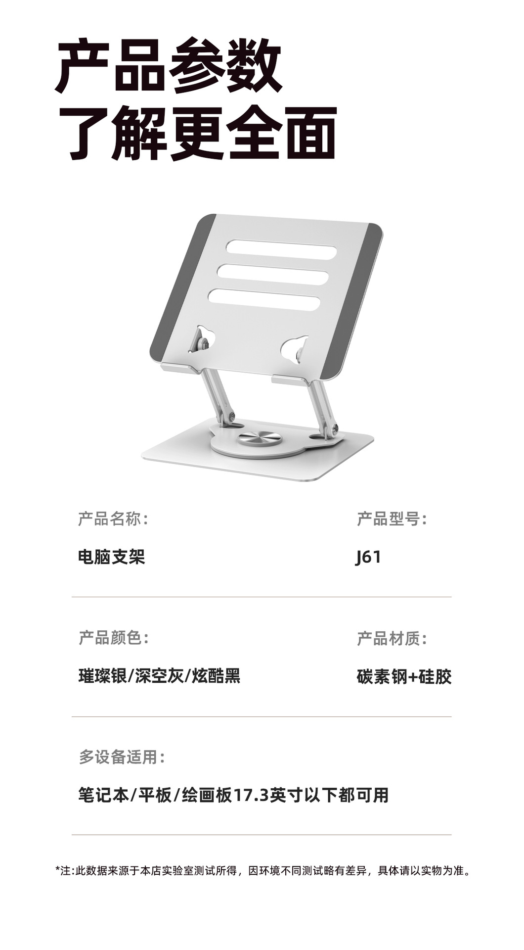 颜色 J61奶白色【360度旋转】,J61炫酷黑【360度旋转】,J29银色【可旋转合金钢材质】,J29灰色【可旋转合金材质】,J41银色【可旋转合金材质】,J41灰色【可旋转+带风扇散热】,J42银色【不可旋转+带风扇散热】,J42灰色【不可旋转+带风扇散热】,J30银色【不可旋转合金材质】,J30灰色【不可旋转合金钢材质】,J33银色【可旋转铝合金材质】,J33灰色【可旋转铝合金材质】