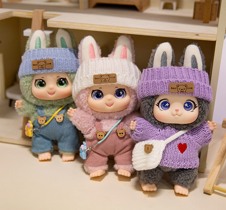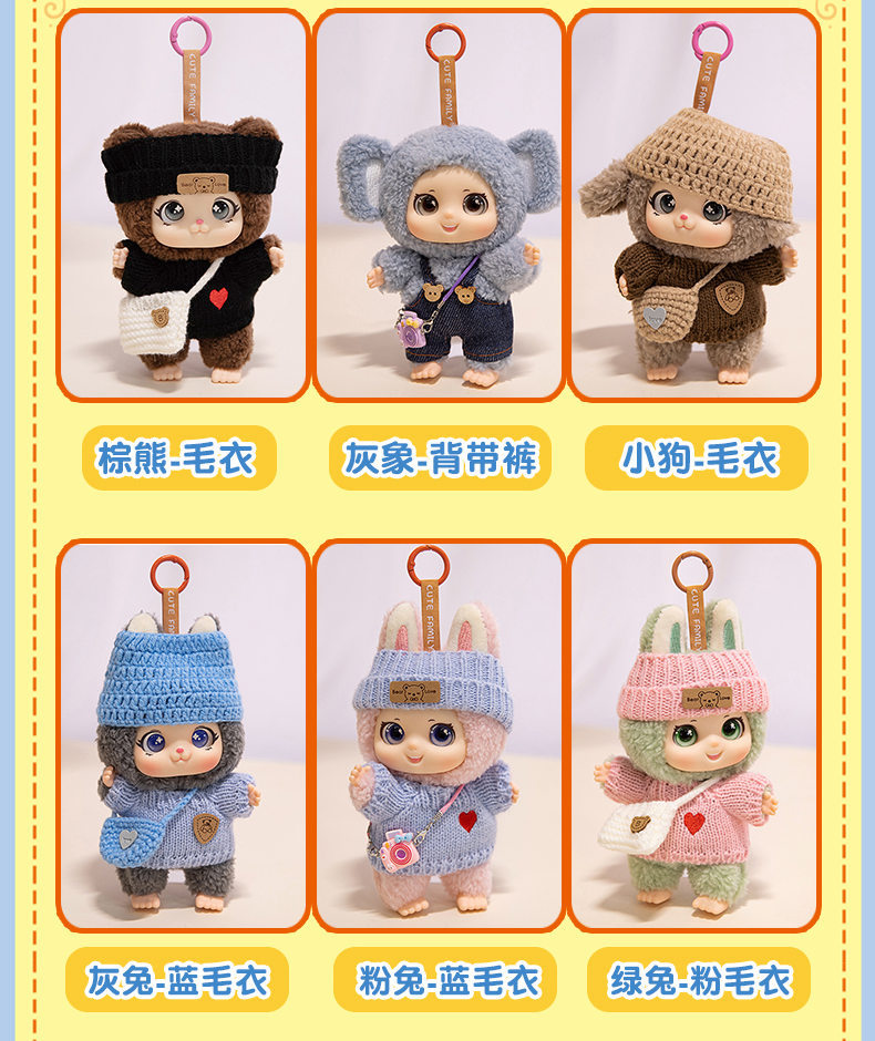 颜色 灰象-背带裤,灰兔-紫毛衣,粉兔-粉背带裤,绿兔-蓝背带裤,绿兔-粉毛衣,粉兔-蓝毛衣,棕熊-毛衣,灰兔-蓝毛衣,小狗-毛衣,绿兔-蜜蜂款,粉兔-蟑螂服,灰兔-恐龙服,绿兔,粉兔,棕熊,灰兔,小狗,灰象