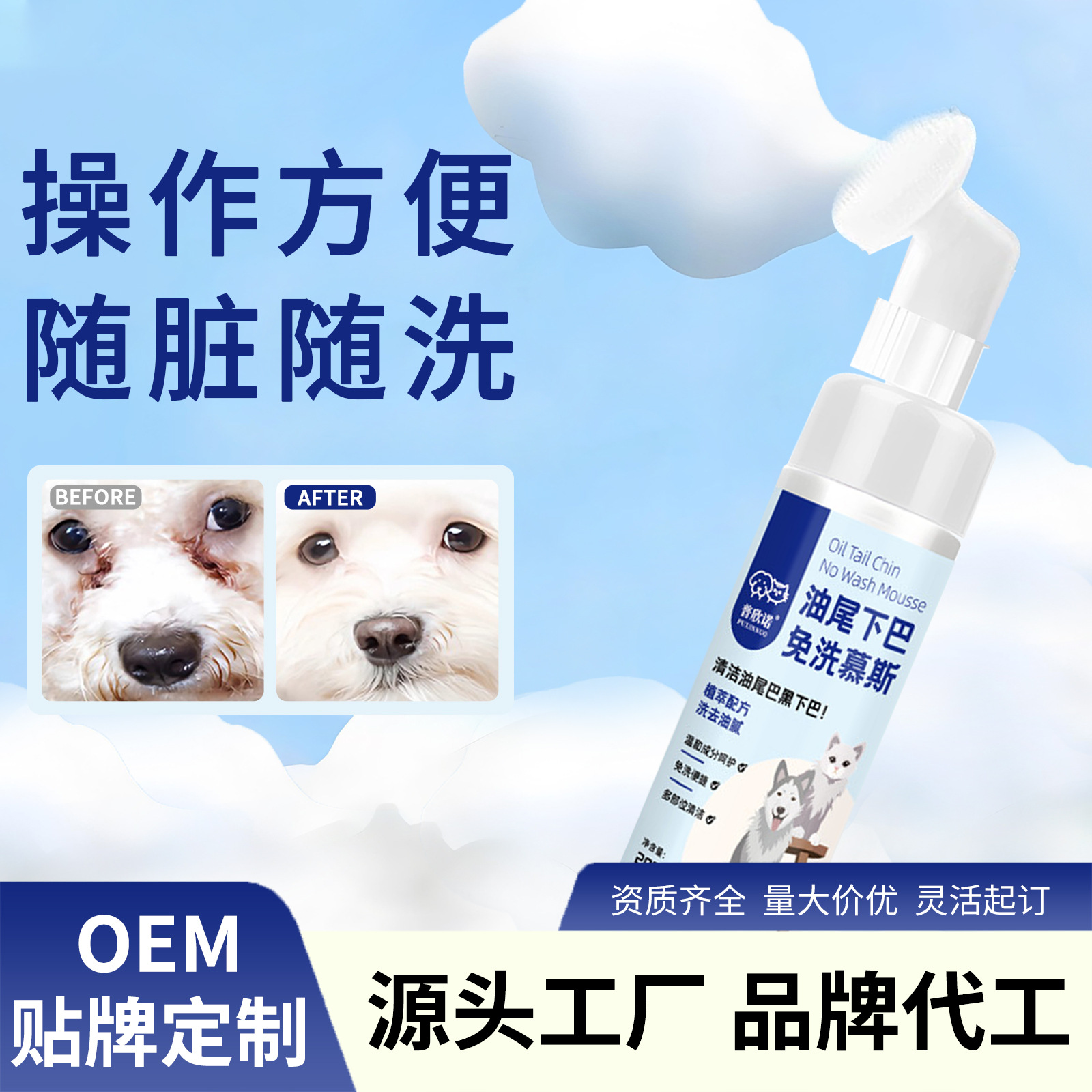 普欣诺猫咪油尾黑下巴免洗慕斯200m宠物户外清洁足爪免洗泡沫批发