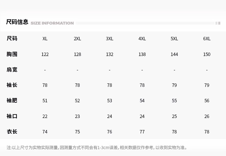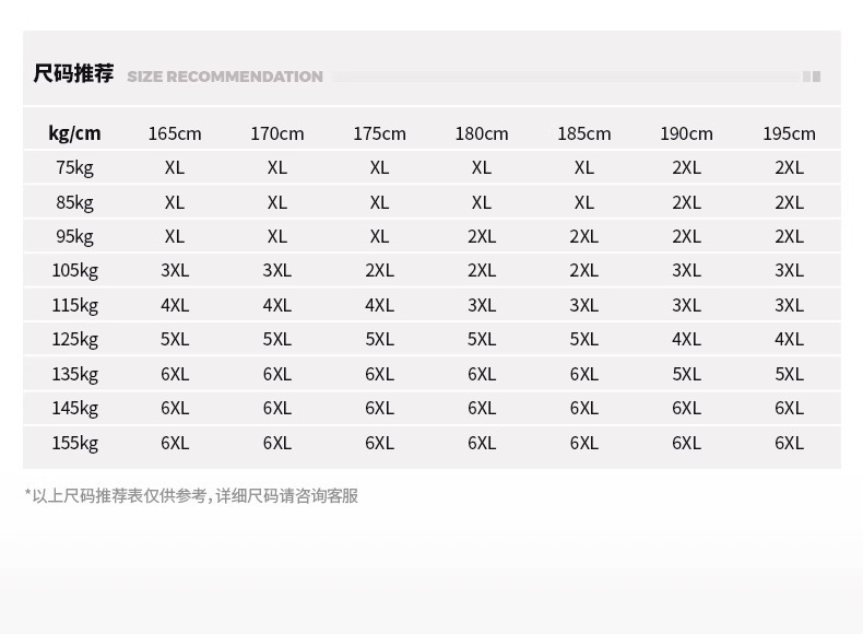尺码 XL建议120-140斤,2XL建议140-160斤,3XL建议160-175斤,4XL建议175-190斤,5XL建议190-210斤,6XL建议210-240斤,7XL建议240-260斤,8XL建议260-280斤