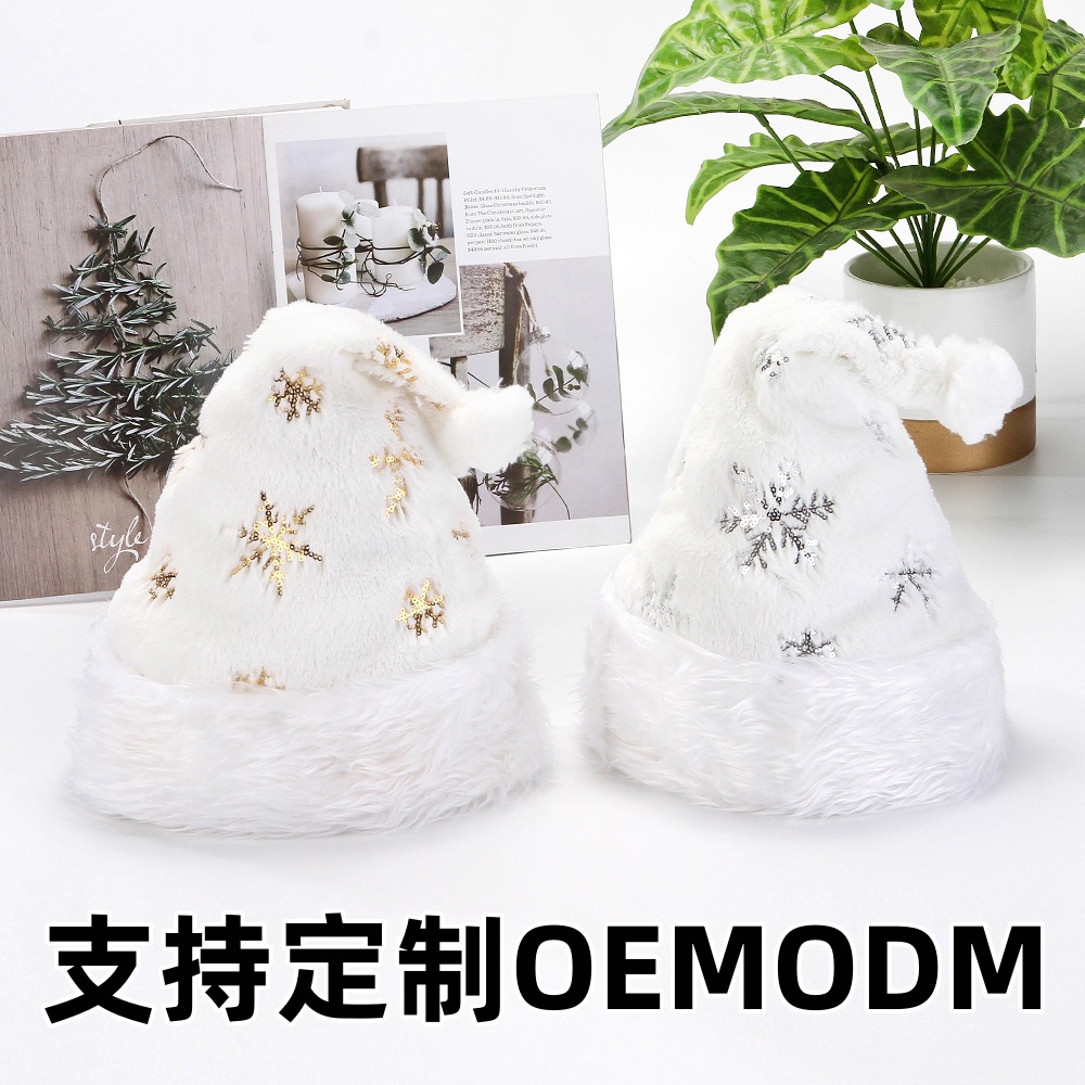 クロスボーダー白いぬいぐるみクリスマス帽子金銀ビーズ片雪花刺繍成人サンタクロース帽子祝日家庭装飾