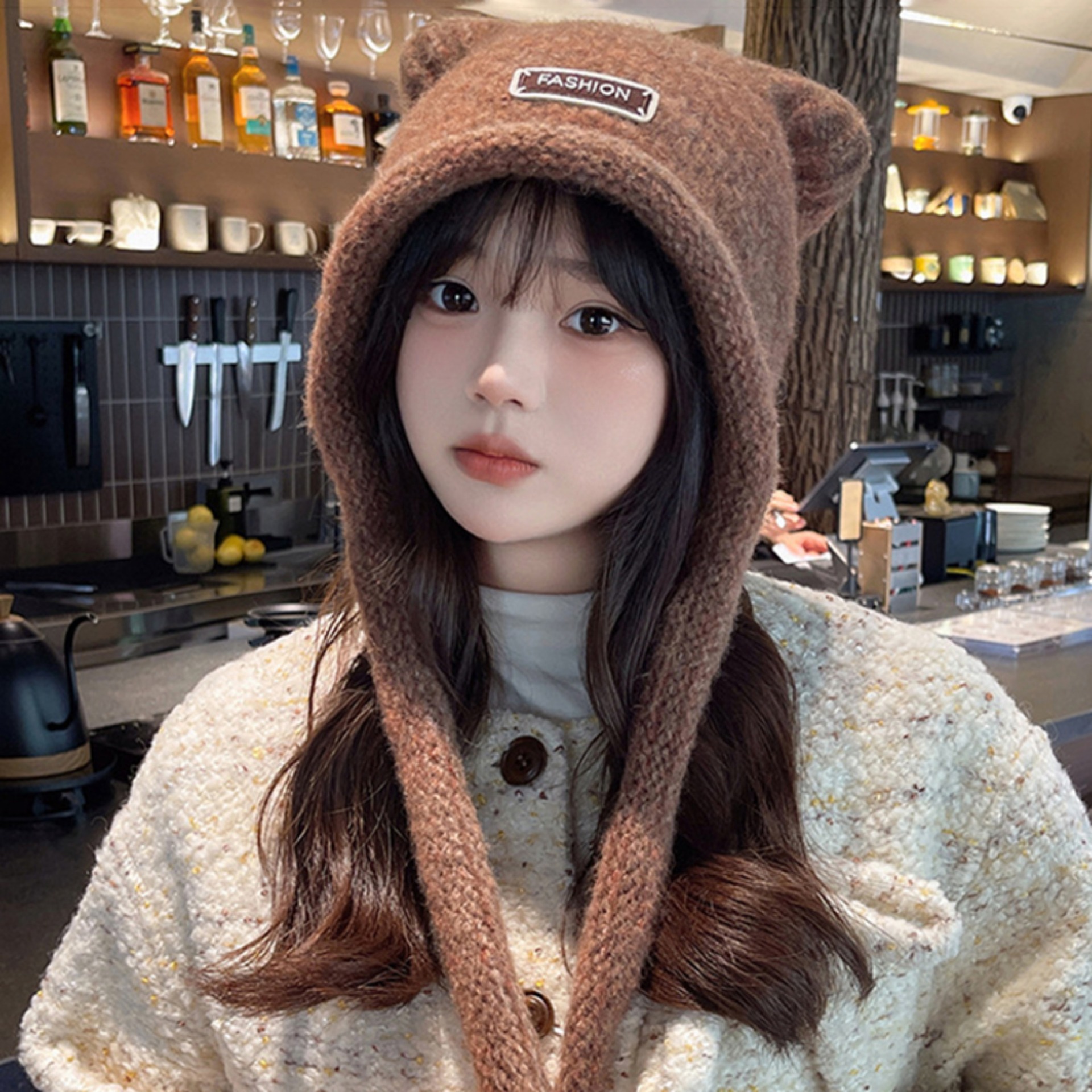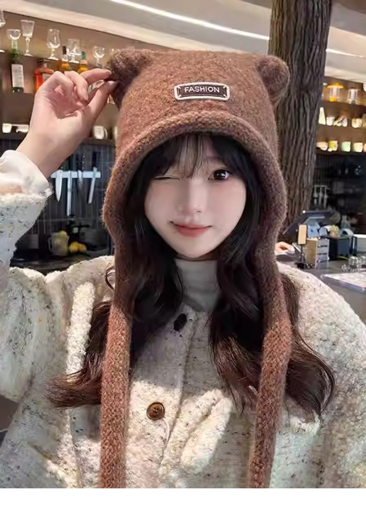 可爱小熊耳朵毛绒针织帽子女冬季加厚保暖护耳毛线帽百搭显脸小潮