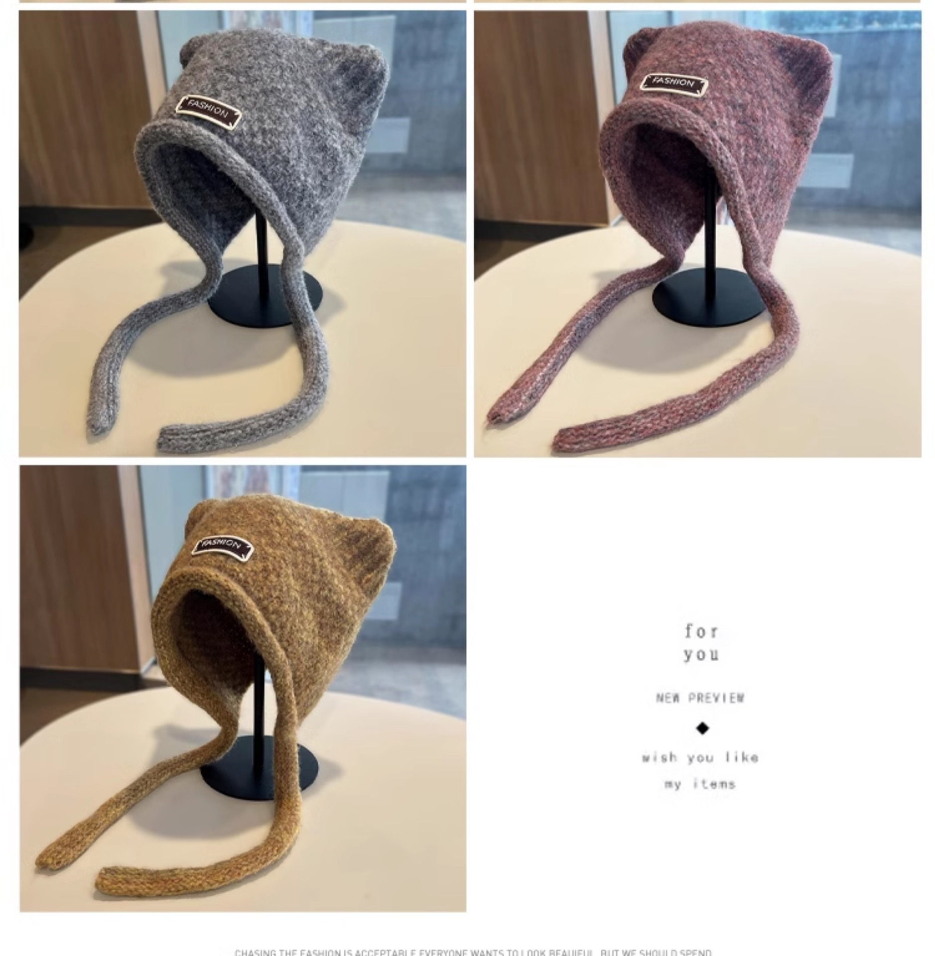 针织帽子女秋冬季新款保暖可爱耳朵毛线帽户外休闲慵懒针织套头帽