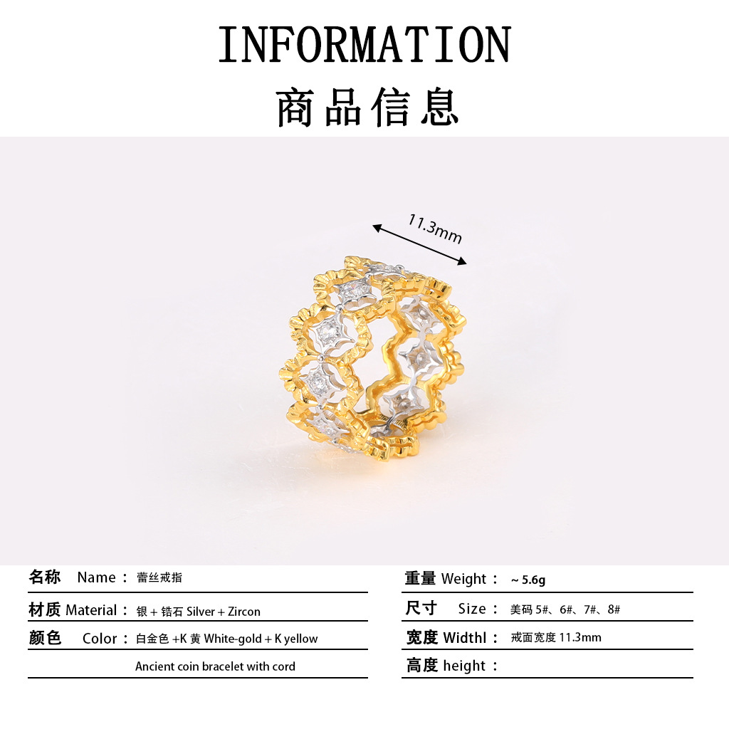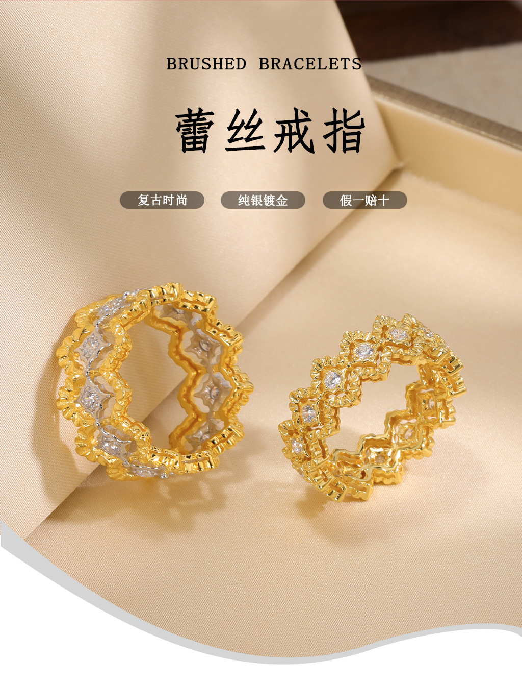ライブで話題のシルバーアクセサリー新作S925純銀レースリング金メッキ中空メッシュリング女性用欧米風ワイドバージョン