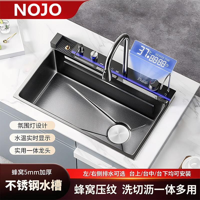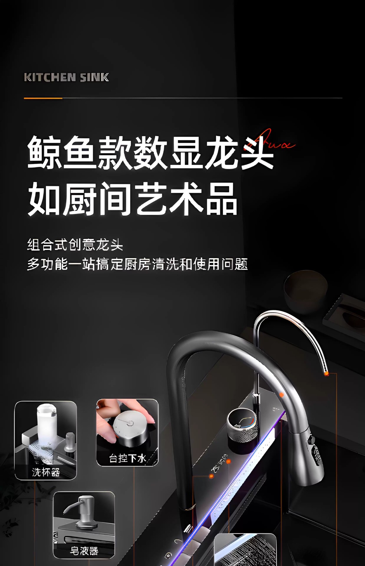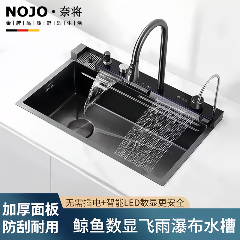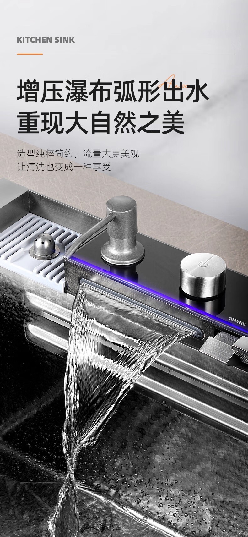 超厚5.0鲸鱼飞雨瀑布304厨房蜂窝水槽单槽数显加厚不锈钢洗菜盆