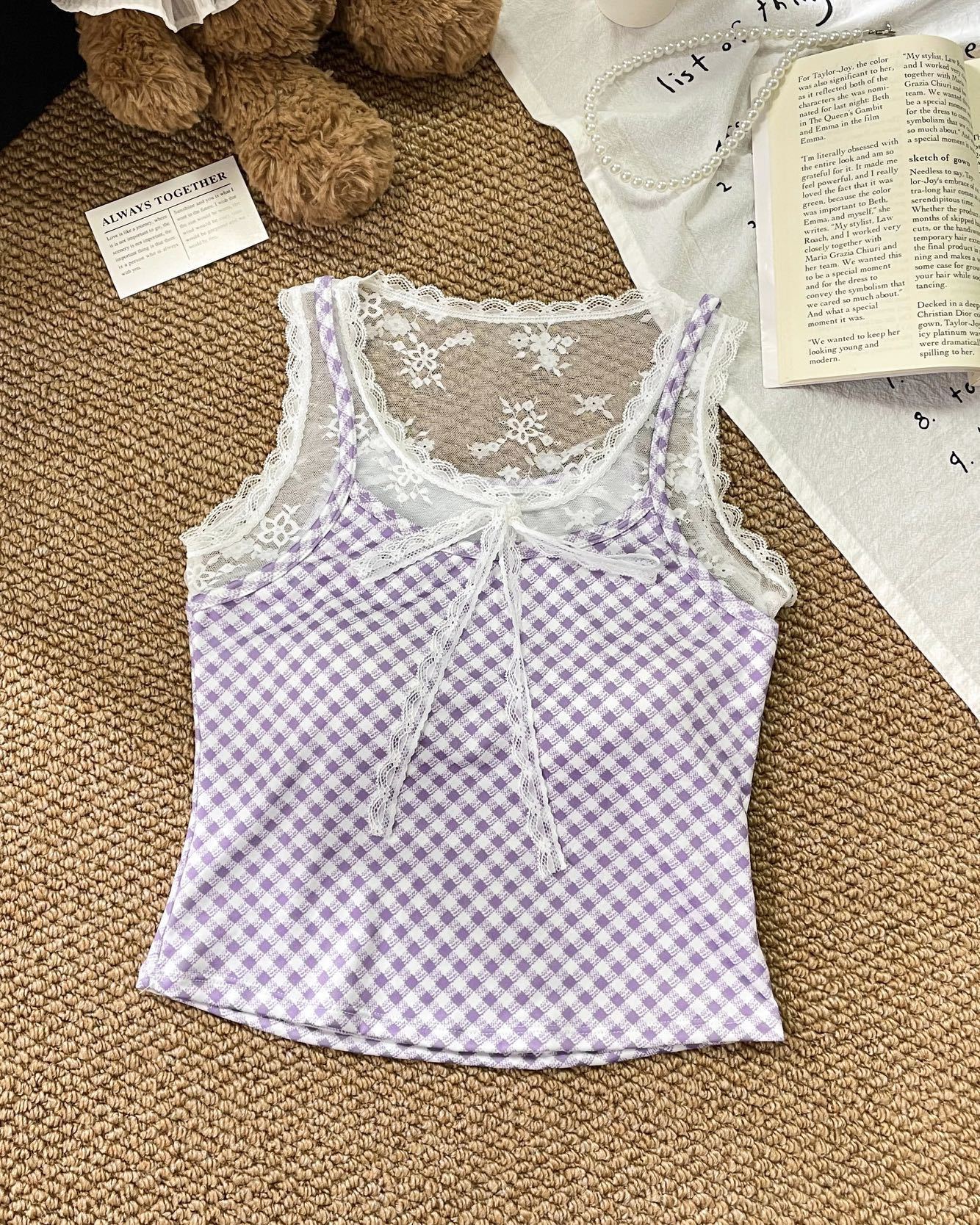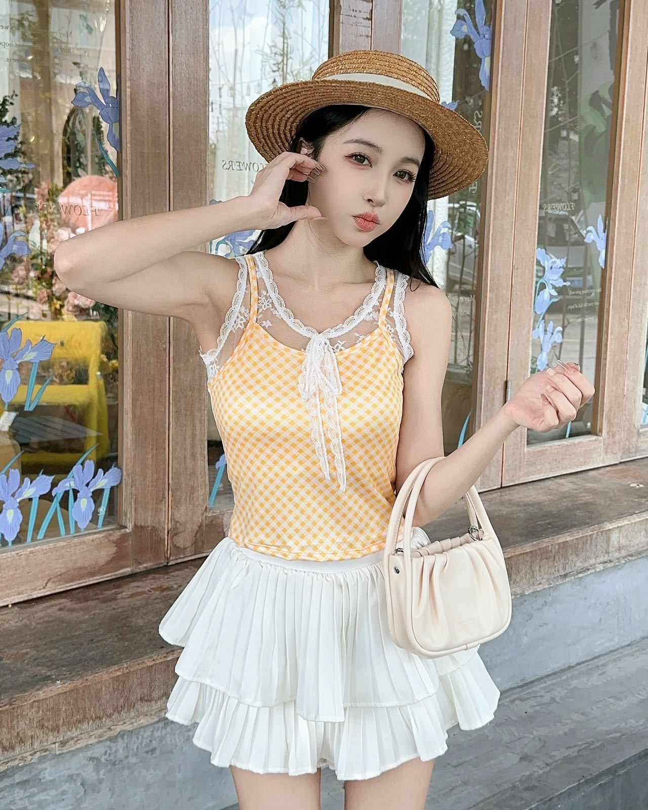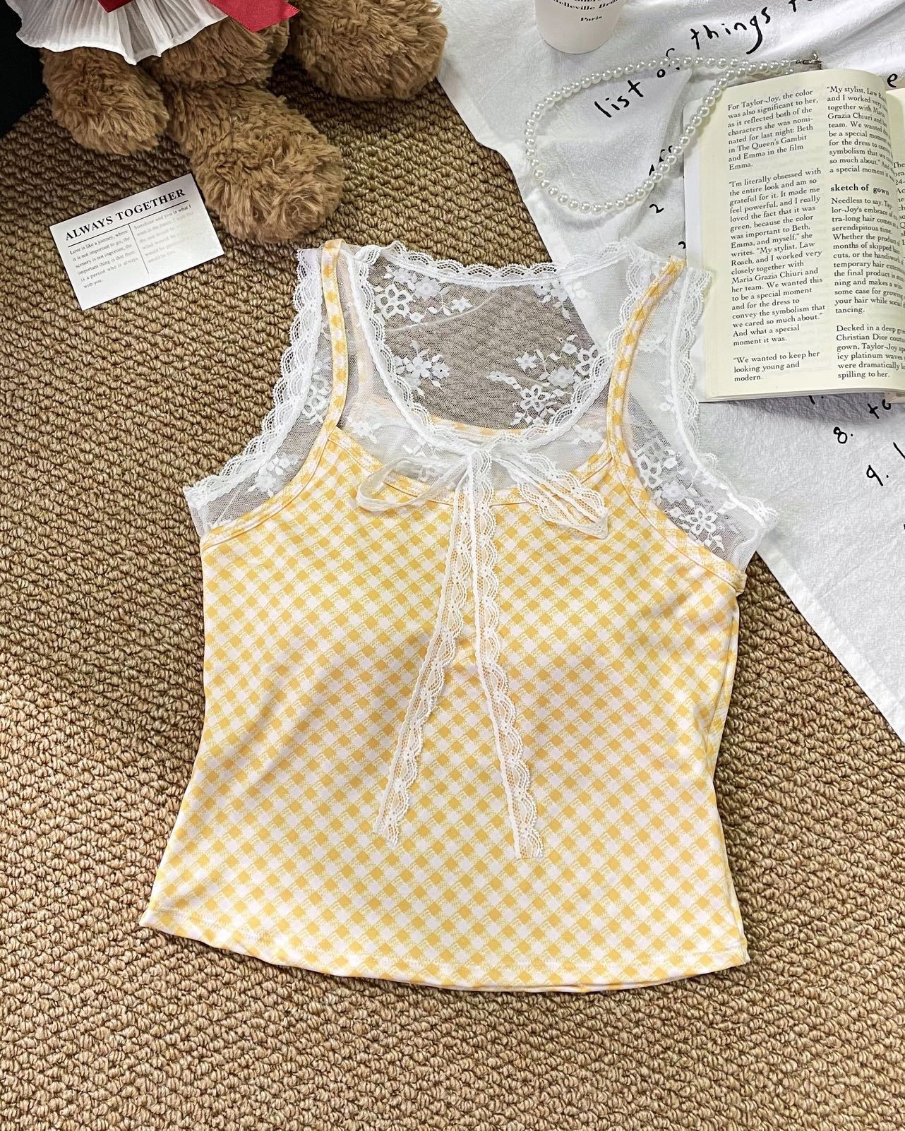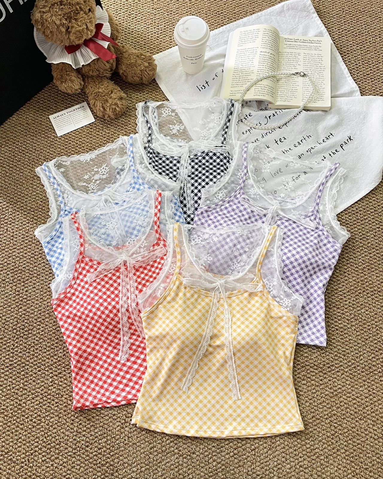 L33024#新款女装时尚拼接花边格纹蝴蝶结吊带上衣修身吊带短款