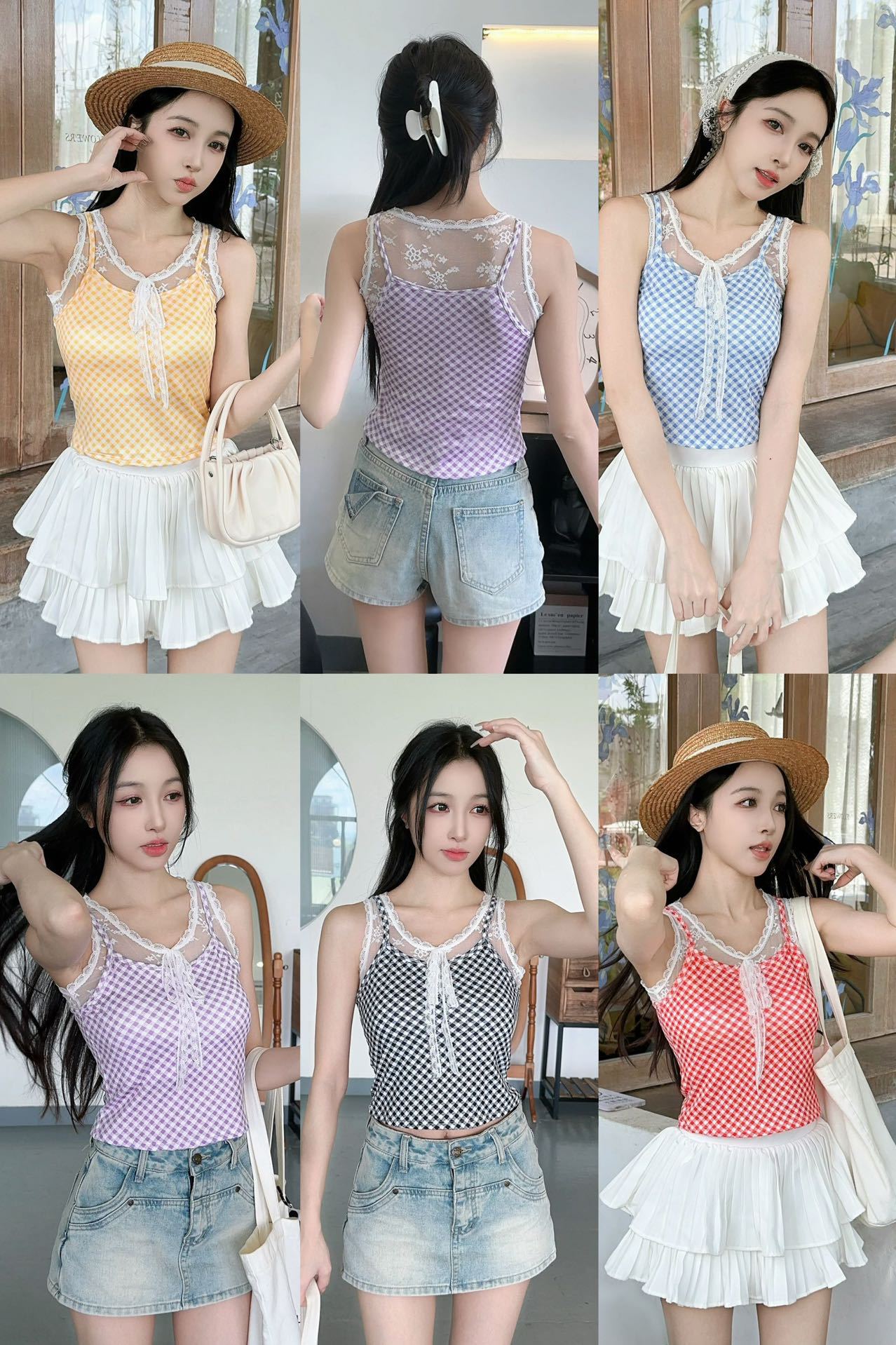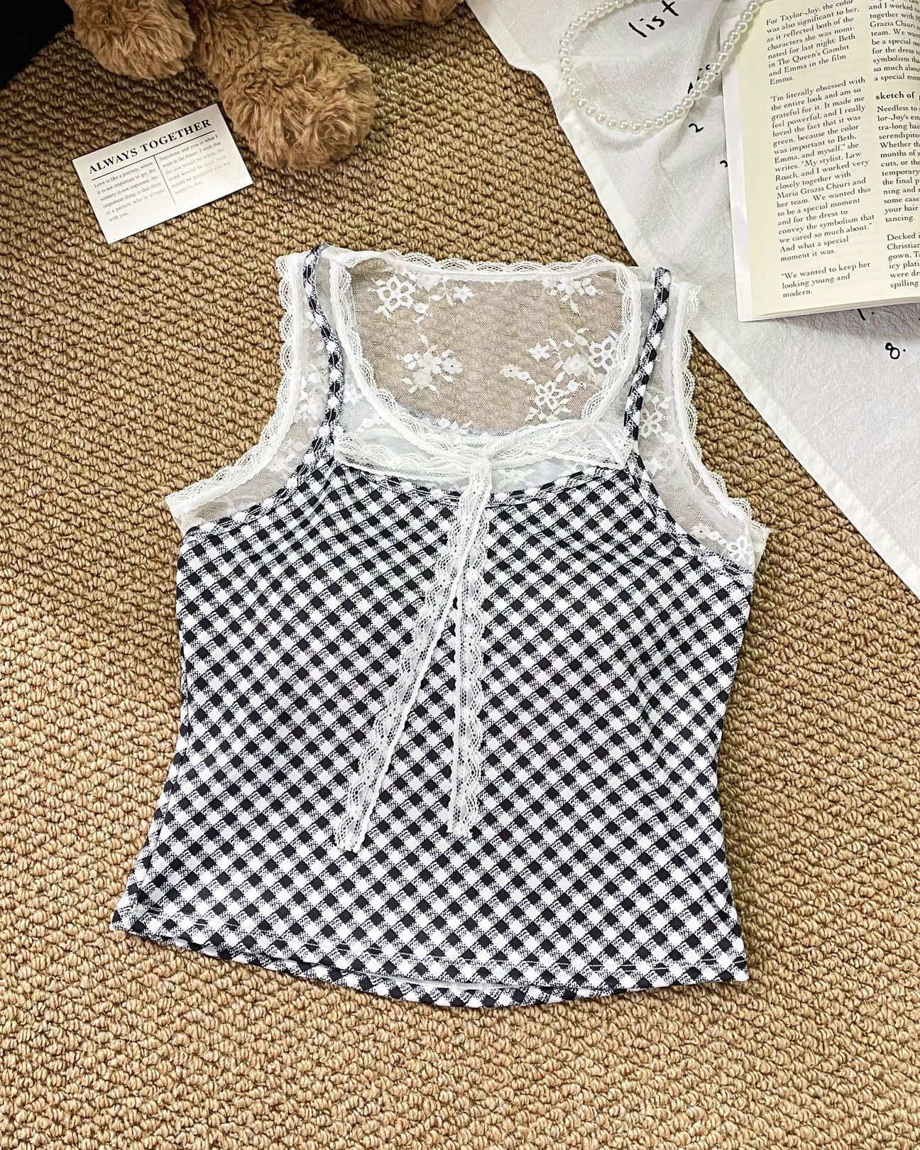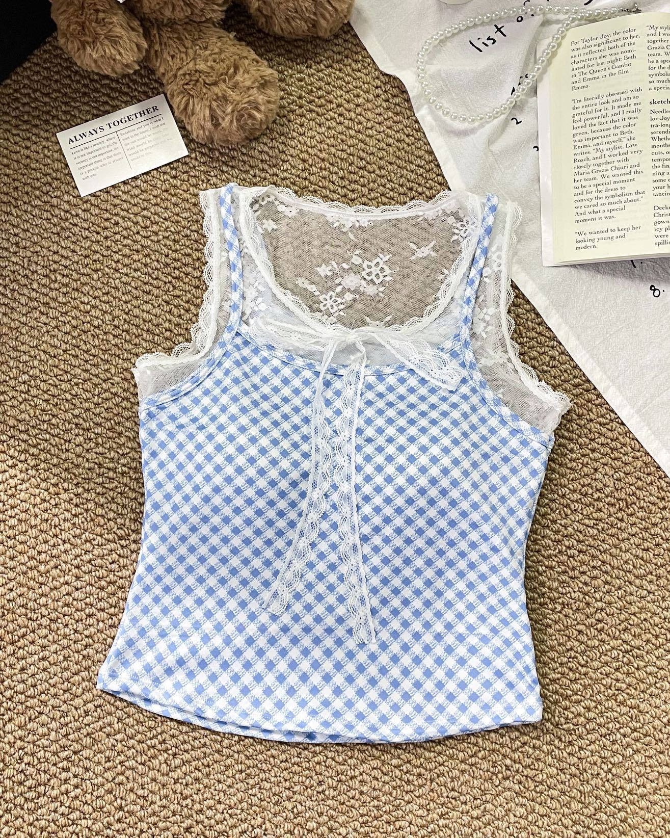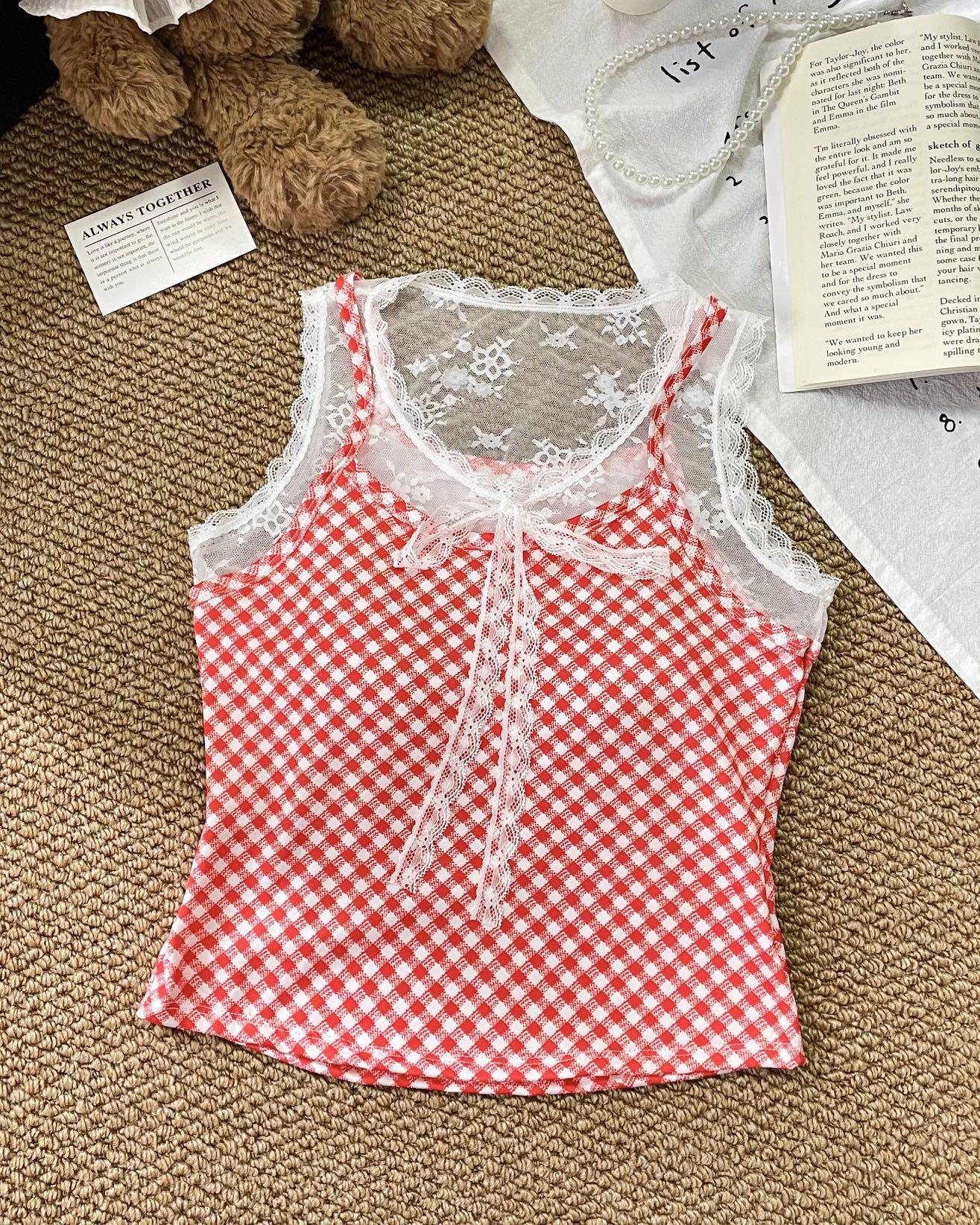 L33024#新款女装时尚拼接花边格纹蝴蝶结吊带上衣修身吊带短款