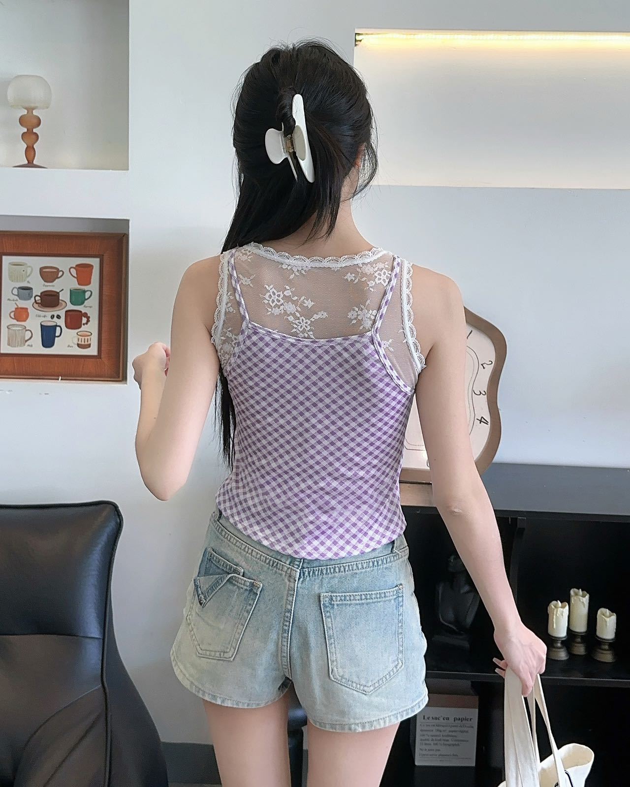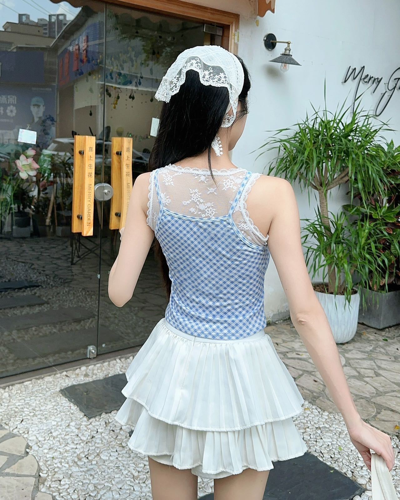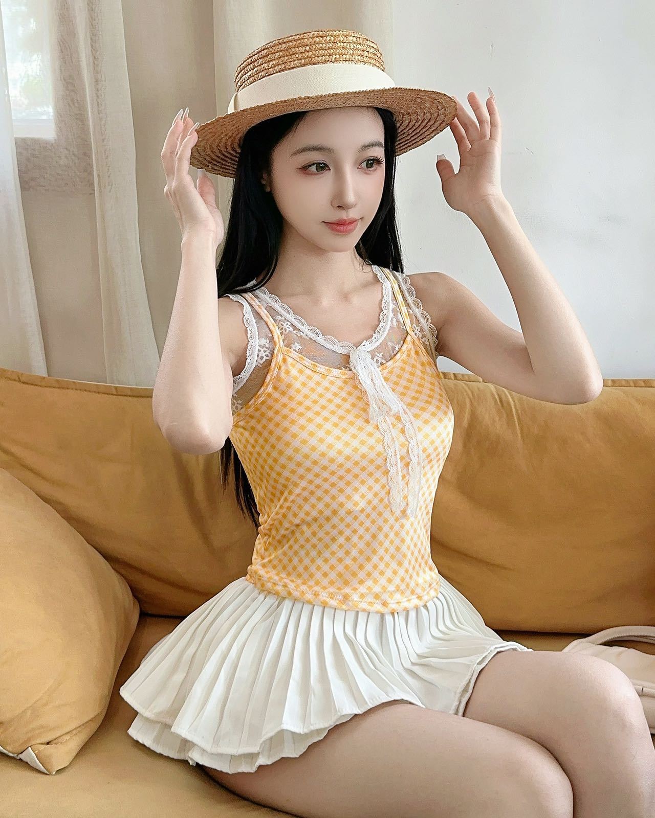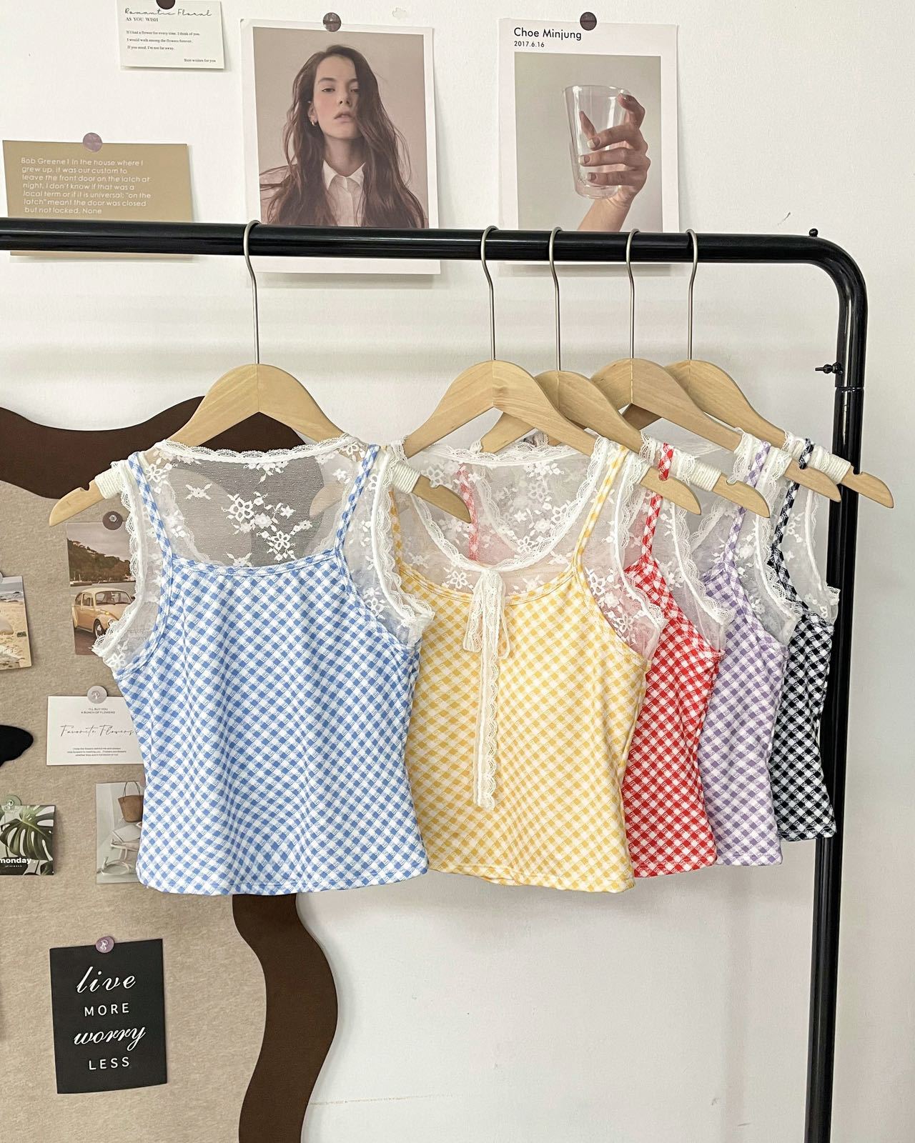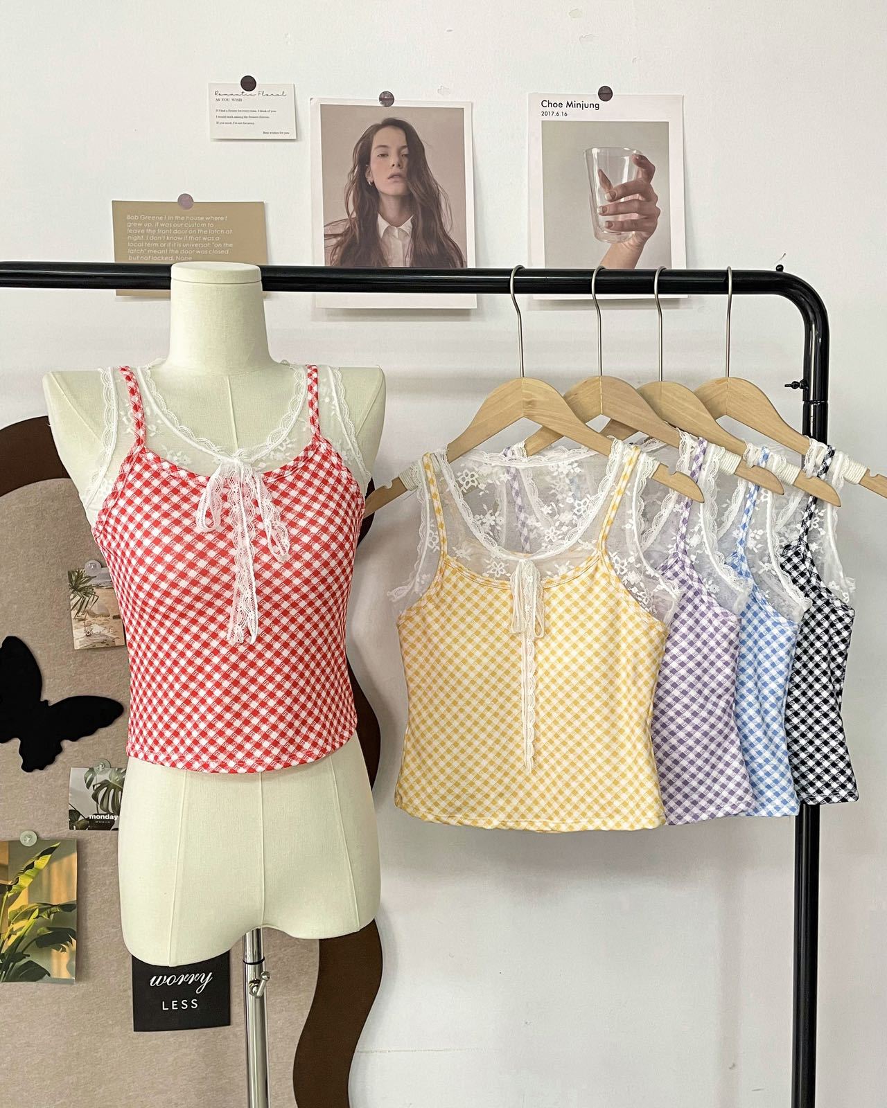 L33024#新款女装时尚拼接花边格纹蝴蝶结吊带上衣修身吊带短款