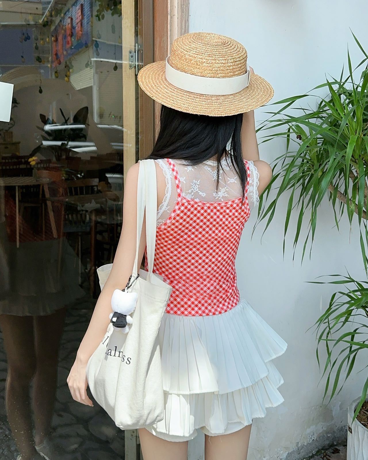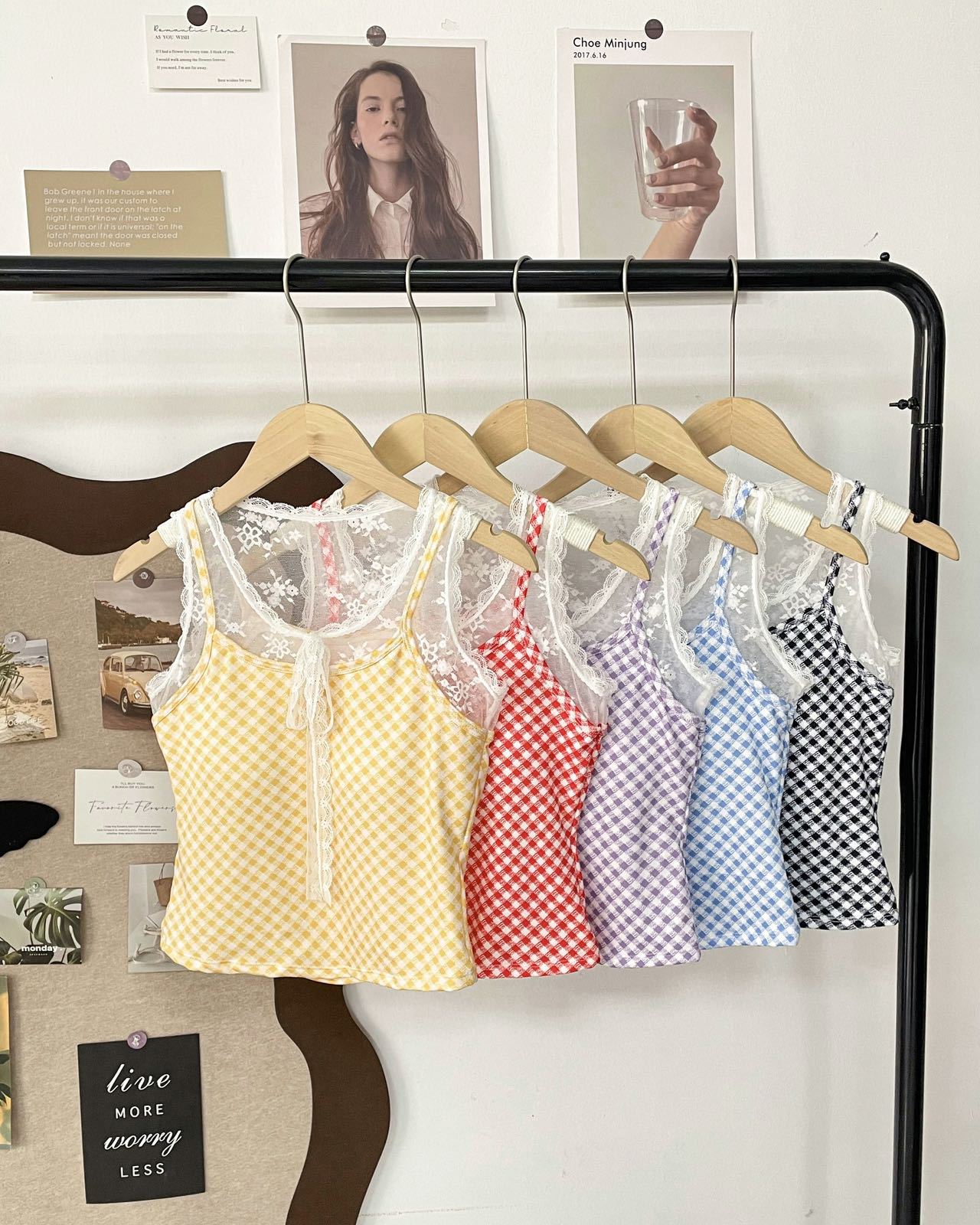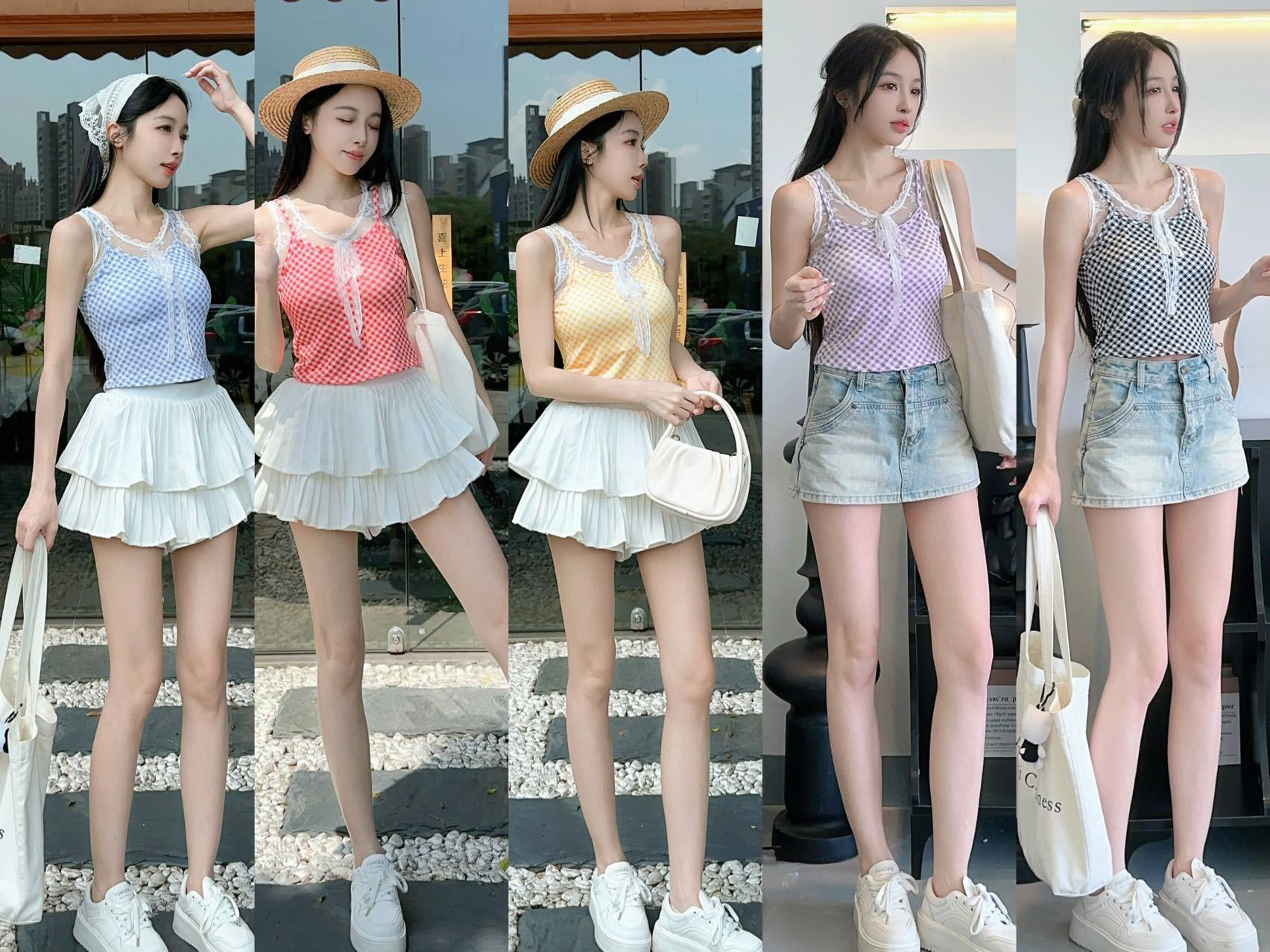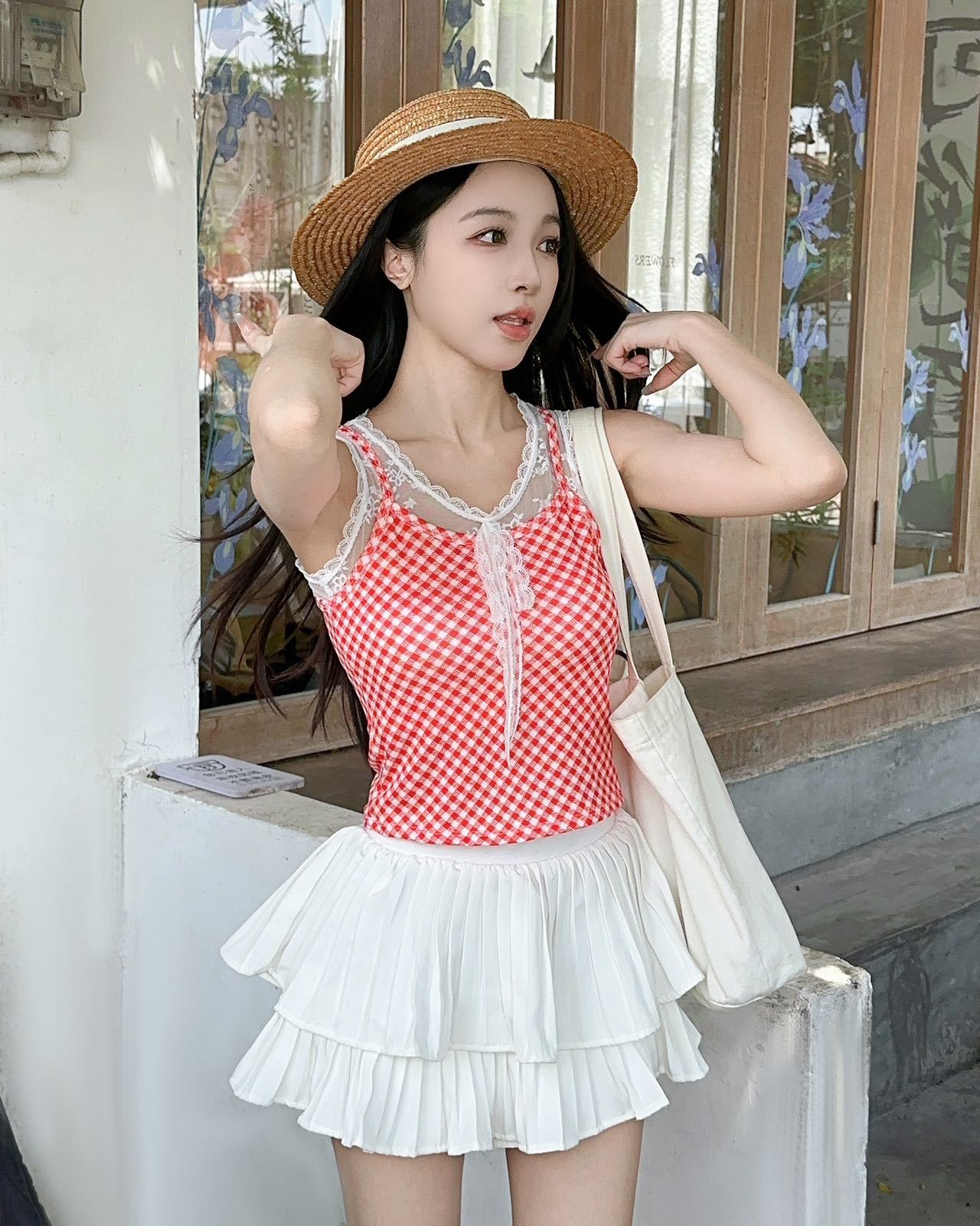 L33024#新款女装时尚拼接花边格纹蝴蝶结吊带上衣修身吊带短款