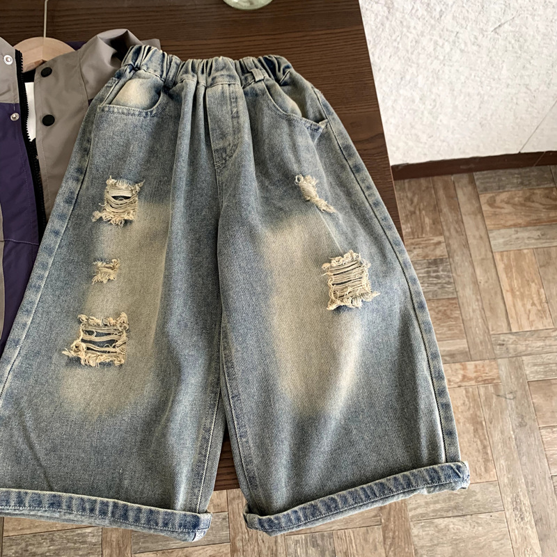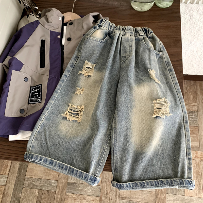 男の子の夏の半ズボンの洋風の子供は穴を割って古いデニムの中でズボンの2025の新型の流行の赤ちゃんの薄いタイプの服をします。