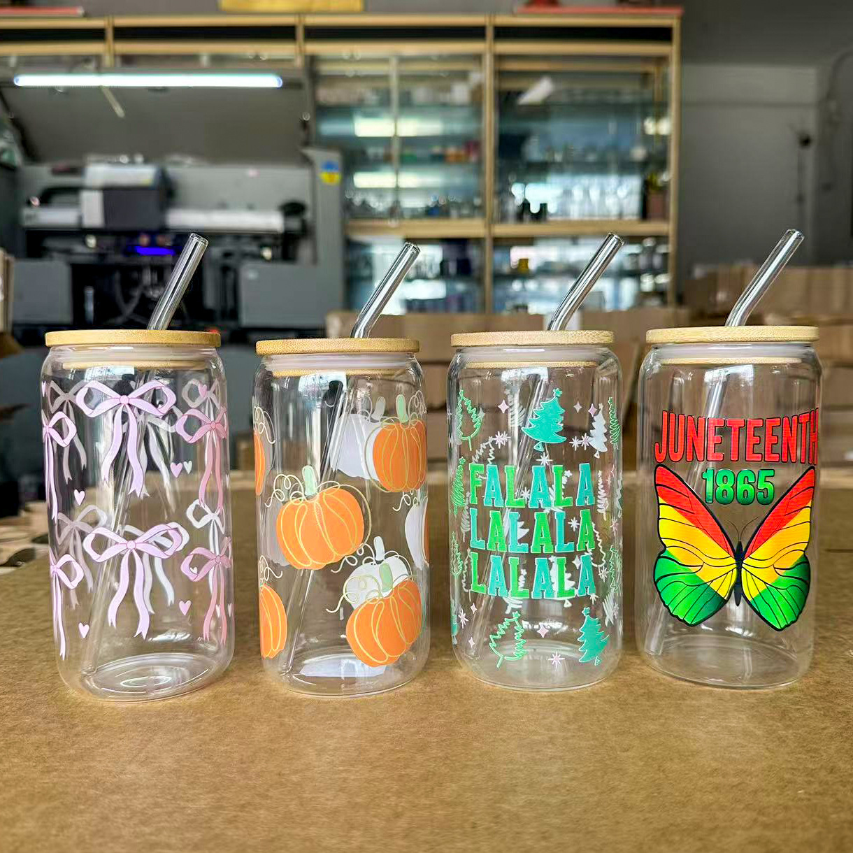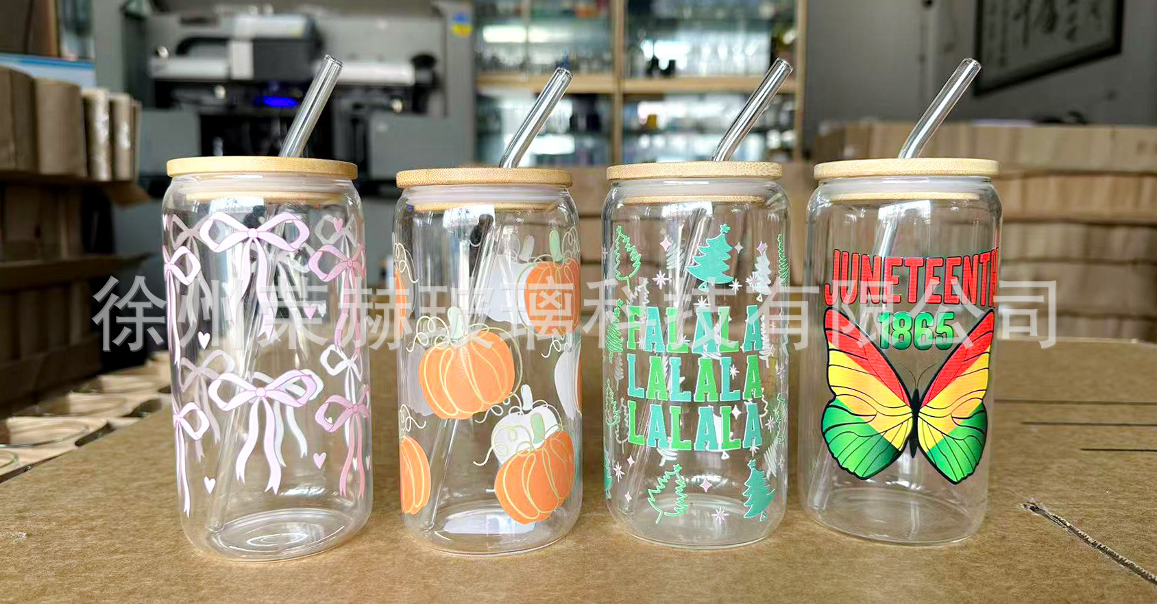 圣诞系列16oz玻璃可乐杯亚马逊跨境爆款水杯高硼硅吸管杯定制图案